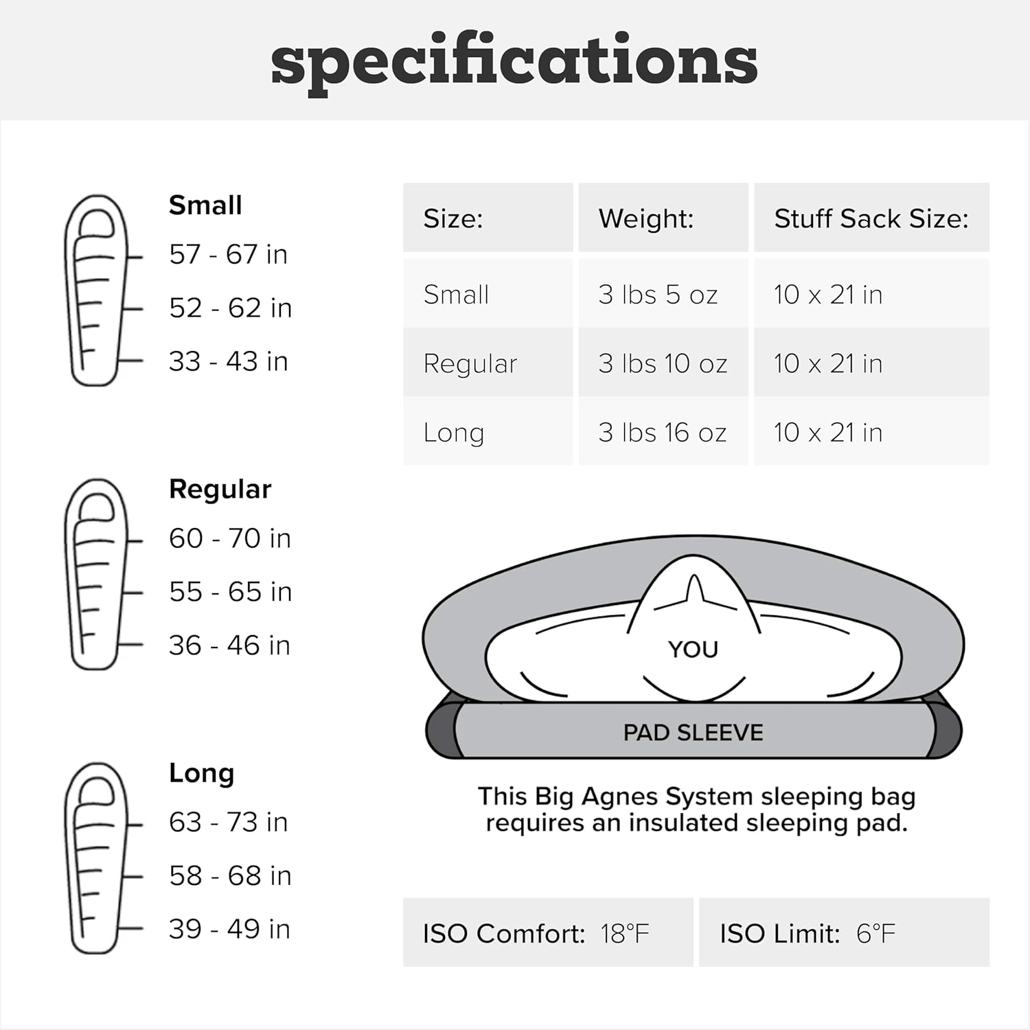 | Product Benefits | Customizable fit, secure sleep, premium warmth, ultralight performance |