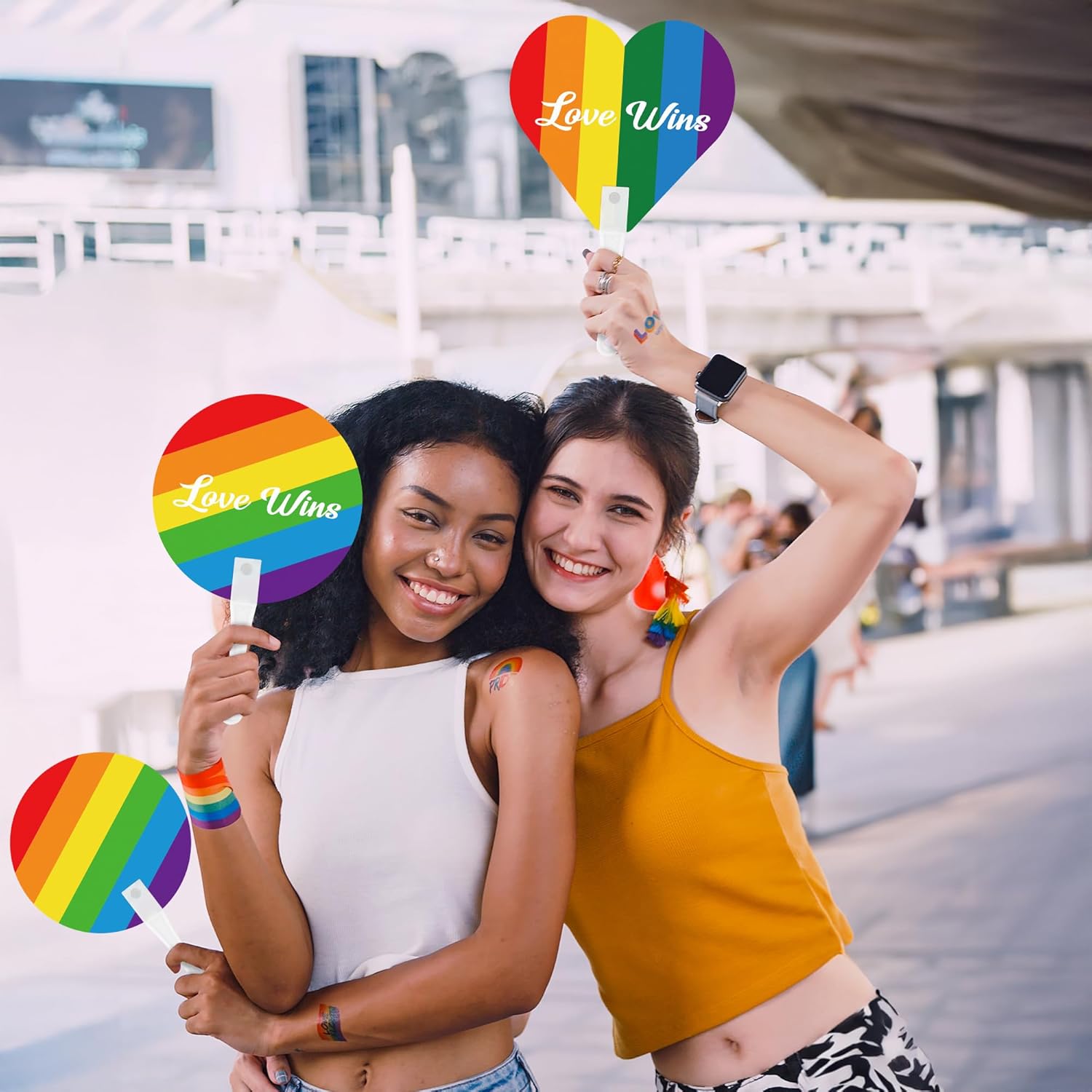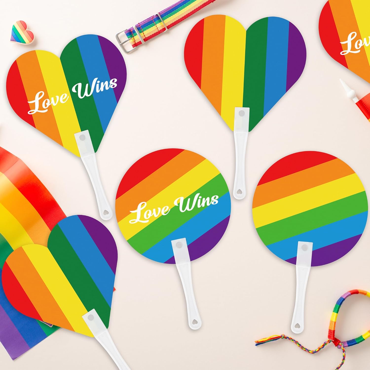 Our LGBTQ hand fans: a vibrant blend of colors, a symbol of unity. Wave it high, let Pride fly!Our Advantages:100 LGBT rainbow fans are perfect for Pride Month parties, parades and more.Our fans are sized at 10.2 x 6.2 inches. They are compact, adorable and easy to carry.Rainbow hand fans are made of PP plastic. They're sturdy, reliable, hard to break, and reusable.Our gay fans feature the rianbow of the LGBT flag and the "Love Wins" slogan, which can show your Pride freely. These Pride hand fans are crafted with care to meet the need for expressing individuality on various occasions.Specifications:Material: PlasticColor: RainbowSize: approx. 10.2 x 6.2 inchesPackage includes:50 Pcs Round Rainbow Hand Fans 50 Pcs Heart Pride Hand FansNotes:Manual measurement, please allow slight errors on size.The color may exist a slight difference due to different screen displays.