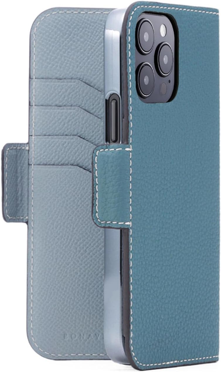 【Description】:A stylish and functional case made for Apple iPhone. The folding function creates a stand allowing you to watch the screen horizontally; perfect for video calls or watching movies. Made of authentic high-grade German Fjord shrunken calf leather. 【Specifications】: Meterial: Outer: Shrink Leather, Inner: Noblesse Leather Genuine leather magnetic flip-style smartphone case with card pockets (3 horizontal, 2 vertical) Size: Compatible with iPhone 15 Pro Weight: 86g Not compatible with MagSafe. Note: Initially, the leather may be stiff, causing the case not to close tightly, but it will gradually soften and conform over a few weeks. Camera Hole: The area around the camera hole is not adhered due to its small size