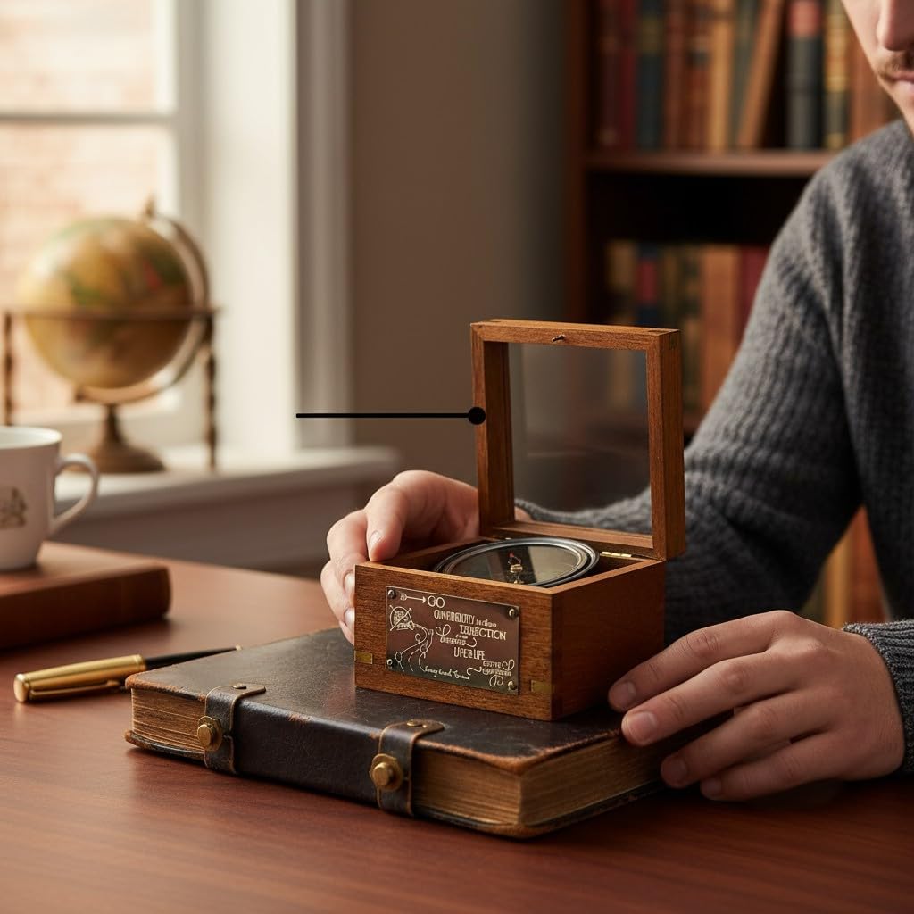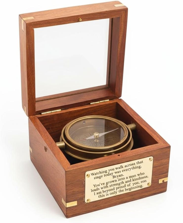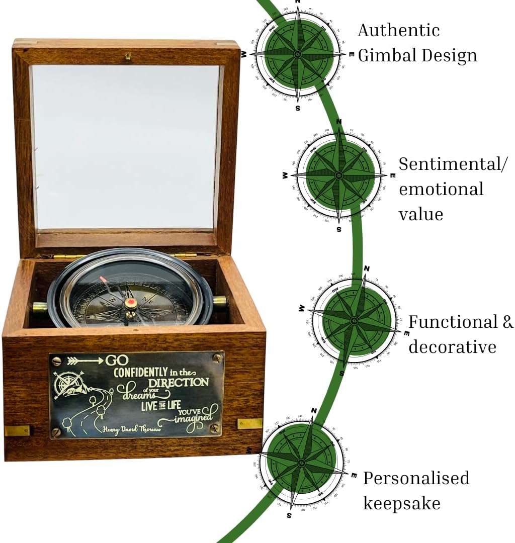 An Inspirational Keepsake for Life’s Journeys Celebrate meaningful milestones with the DOLLOND & CO. Brass Gimbal Compass in Wooden Box, a timeless keepsake engraved with the inspiring words of Henry David Thoreau: “Go confidently in the direction of your dreams.” Thoughtfully designed to symbolize guidance, courage, and purpose, this compass serves as a lasting reminder to follow one’s own path with confidence. A Gift That Speaks with Meaning Whether marking a graduation, retirement, baptism, or special achievement, this engraved compass offers more than decoration—it delivers a message of encouragement and belief. It is a thoughtful gift for explorers, dreamers, students, professionals, and anyone stepping into a new chapter of life. Authentic Brass Gimbal Compass Design Crafted from solid brass, this gimbal compass reflects traditional maritime instruments used for navigation at sea. The gimbal mount allows the compass to remain level, while the antique brass finish enhances its vintage character. Both functional and decorative, it blends historical craftsmanship with symbolic meaning. Inspirational Thoreau Quote Engraving The engraved Henry David Thoreau quote adds depth and purpose to this keepsake. Known for inspiring self-reliance and personal growth, the quote transforms the compass into a message of motivation—perfect for moments of transition and reflection. Premium Wooden Keepsake Box with Glass Lid The compass is beautifully housed in a handcrafted wooden box featuring a clear glass lid and engraved brass plate. This elegant presentation protects the compass while making it ideal for display on a desk, shelf, or mantel. The box elevates the overall gifting experience, making it ready to present without additional wrapping. Perfect for Milestone Celebrations This compass makes a meaningful gift for a wide range of occasions. Whether celebrating academic success, career achievements, faith milestones, or seasonal holidays, it offers a timeless symbol of direction and discovery. Ideal for Gifting to Him or Her With its classic design and inspirational message, this brass gimbal compass is suitable for both men and women. From graduates and retirees to explorers and collectors, it appeals to anyone who values meaningful keepsakes and timeless craftsmanship. Perfect for These OccasionsGraduation or academic milestonesRetirement or career achievementsBaptism or faith-based keepsakesChristmas or holiday giftsExplorer or nautical collectiblesA Keepsake to Be Cherished for Years Combining inspirational words, traditional craftsmanship, and elegant presentation, this engraved brass gimbal compass is more than a gift—it is a lasting symbol of purpose, confidence, and life’s journey. Designed to be cherished, it will remain meaningful long after the moment it celebrates.