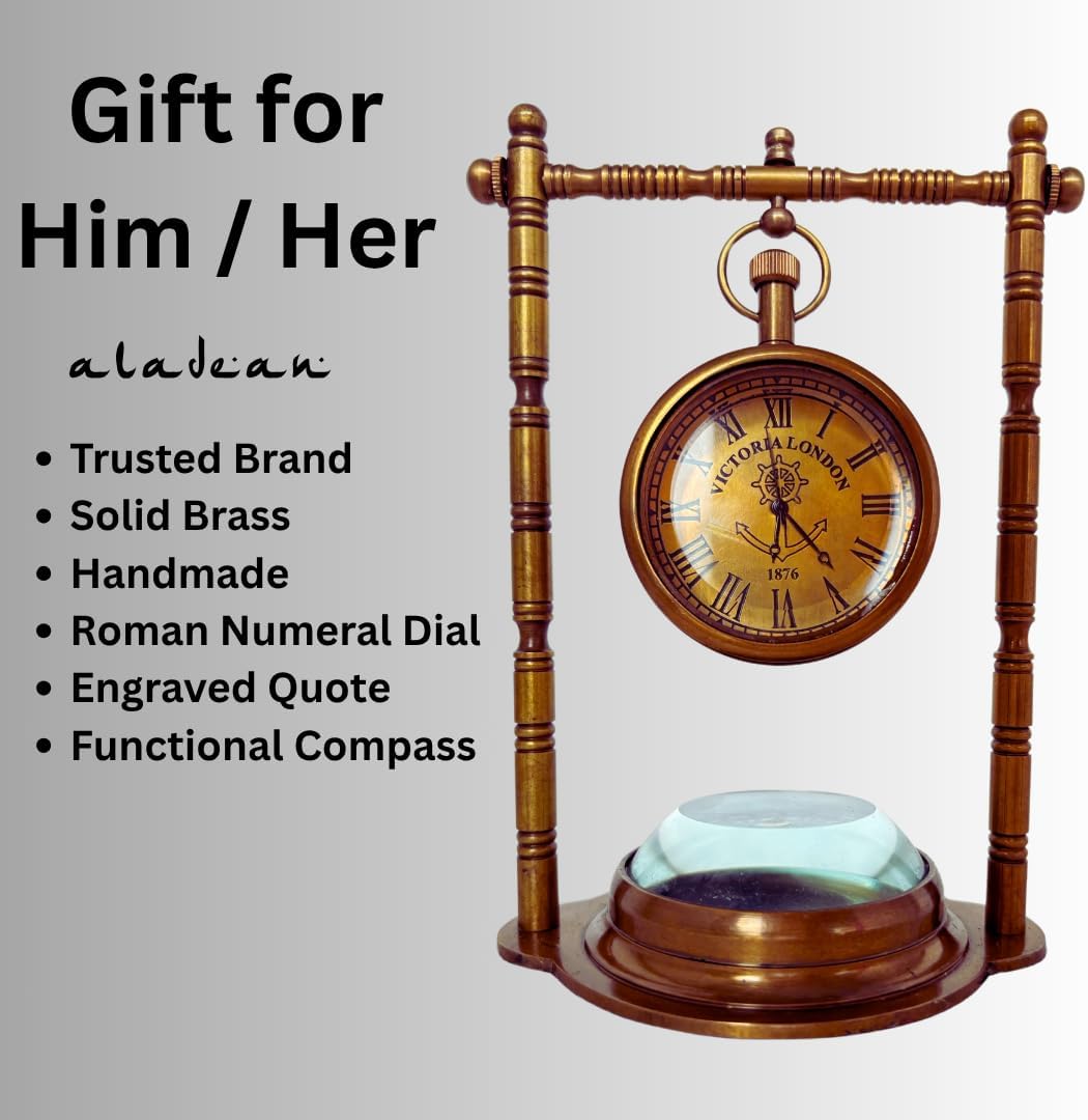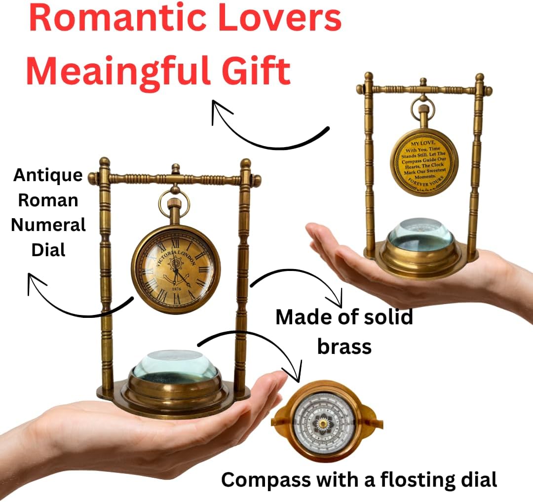Discover timeless elegance with this vintage-style brass table clock and compass combination. This exquisite desk accessory features a 2-inch diameter clock face adorned with classic Roman numerals, paired with a beautifully crafted compass featuring a floating dial and oval lens. Measuring 5.5 x 4 x 3 inches, this handcrafted brass masterpiece makes a striking statement on any tabletop. The clock's romantic engraving reads 'My Love With you time stands still, let the compass guide our hearts, the clock mark our sweetest moments- Forever yours,' making it a perfect anniversary or romantic gift. Ideal for couples celebrating their special milestones, this versatile piece works beautifully in bedrooms, studies, or offices. The manual operation ensures reliable timekeeping without the need for batteries. Each piece showcases meticulous craftsmanship in solid brass, combining both functional timekeeping and decorative appeal. This meaningful keepsake serves as both a practical timepiece and a symbol of enduring love, perfect for expressing deep affection to someone special.