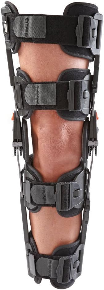 Performance • Easy to use ROM hinge with quick-adjusting flexion and extension stops to control and limit knee flexion and extension • Telescoping calf and thigh sleeves for sizing a wide range of patients from 5’ to 6’4” tall • Easy to use extension drop lock allows the brace to be locked out in 5 positions (in -10°, 0°, 10°, 20°, and 30°) of knee extension with the push of a button • Stiff telescoping bars and overall brace design limits knee range of motion • Accommodates right or left leg Easy to Use • Extremely quick application time and simple to adjust to enhance patient compliance and comfort • Trimmable straps for size customization • Strap lock clips keep straps positioned on bars and the hinges in the correct placement around the knee • Quick clip buckles allow for easy application and removal of the brace Comfort • Comfortable padding throughout the brace, designed with patient compliance in mind • Brace is lightweight, weighing less than 35 oz (standard version) • BridgeTech Incision pad relieves pressure and provides added comfort around the incision site (optional accessory) • Excellent overall suspension due to the design of the pads, strapping and overall brace • More flexible cuffs allow for better comfort and suspension of the brace • Near universal sizing, with the hinge bars extending from 17” to 27” to accommodate a wide range of patient anatomies