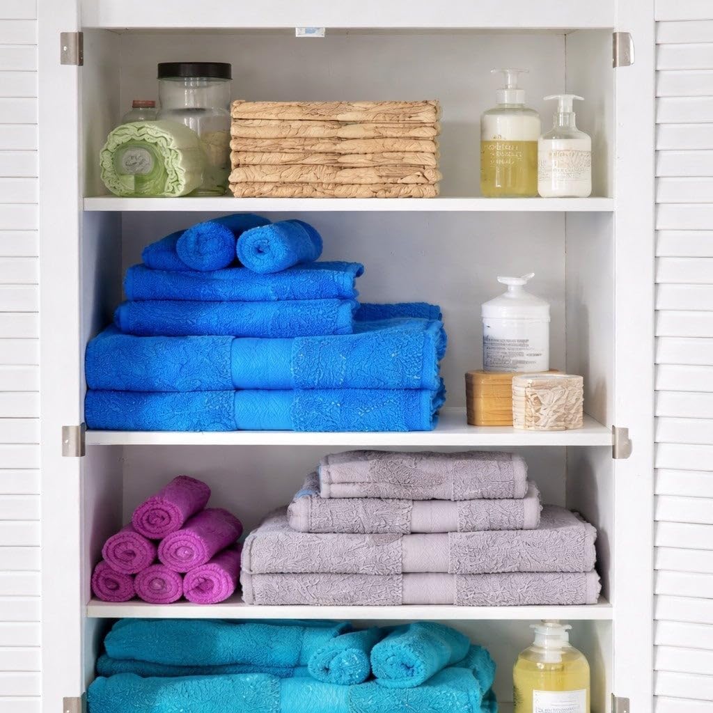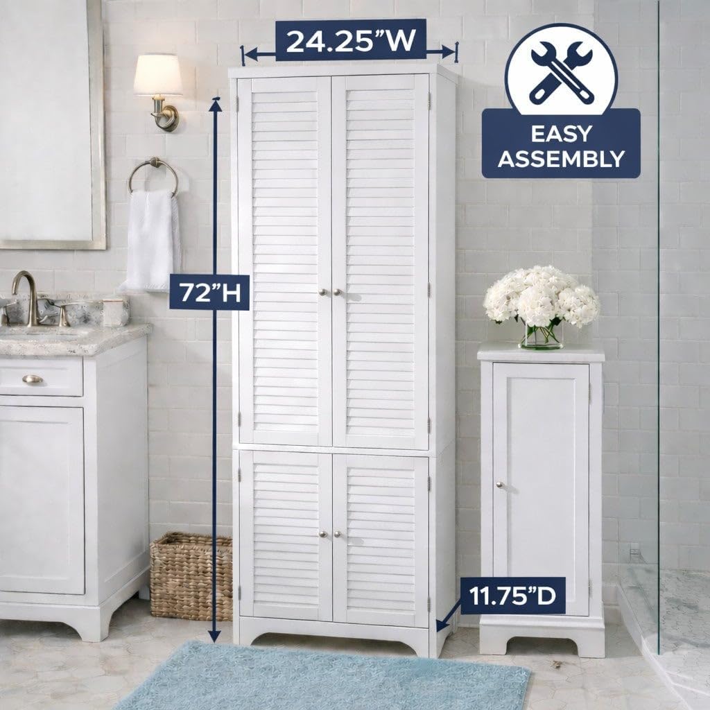 Stylish, space-saving bath coordinates add versatile storage to your space. Perfect storage for linens, towels or bath toiletries. Top double doors open to 4 shelves; bottom double doors open to 2 shelves. Dimensions: 24.25"L X 11.75"W X 72"H MDF with brushed silver knobs Assembly Imported.