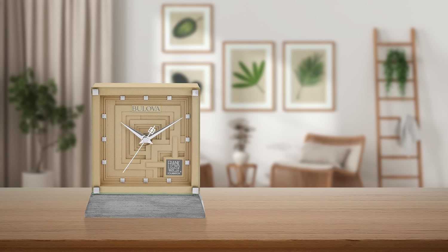 The Ennis is inspired by Frank Lloyd Wright’s “Mayan Revival” textile block homes in Southern CA. Originally made of concrete, a “new” construction material in the 1920’s The Blocks were able to lend a textural appearance showing varying depths. This clock is an example of this type of concept made of case resin and showing multiple layers taken directly from the Ennis house’s block designs. To replicate the case concrete there is a sand finish to the case, and it is mounted on a washed gray ash wood base. The accurate quartz movement uses (1) AA battery (not included).