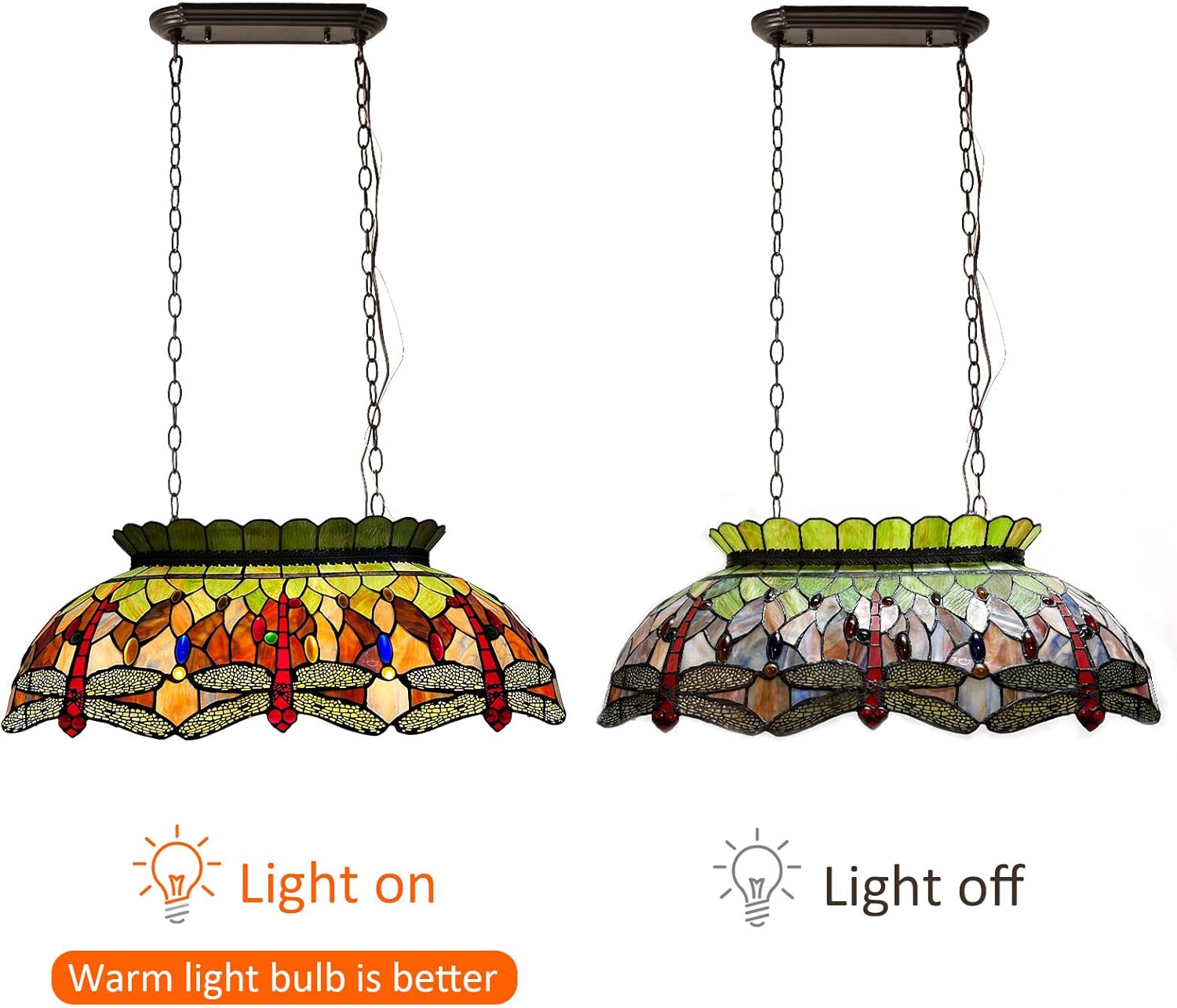 Capulina dragonfly style handcrafted stained glass pool table light lampshade is slight heavy than you expected, because it is made of real stained glass, not a plastic shade. But when you knock it, it sounds like plastic. Because of its special manufacturing process. Each glass piece is cut by hand then polish the edge before wrapping the copper foil. The edges of the glass pieces are wrapped with adhesive copper tape (copper foil). Then putted together in a mould according to the pattern. At last, using soldering material to weld each glass at a very high temperature. If you are familiar with tiffany stained glass shade and stained glass panel, you will know there is air between each piece glass. So it sounds like plastic when you knock it. That's tiffany stained glasses' feature. The Stained glass is Much Heavy than Plastic, and couldn't been burned, normal knife couldn't cut them. It is easy to check.