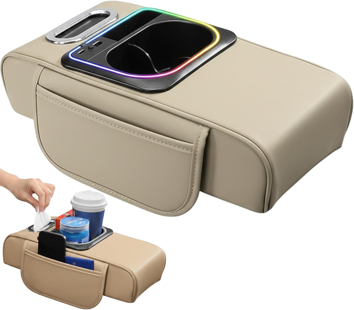 Description: This car armrest cushion features premium leather material that ensures a soft yet reliable surface, significantly boosting driver comfort and protecting your vehicle's center console from scratches and damage. Designed with multiple practical storage options including dedicated phone slots, charging port access, tissue compartment, and a cup holder, it organizes your essentials efficiently, reducing clutter and distractions while driving. Its universals fit design adapts easily to most SUVs, motorhomes, and trucks, providing a stable and secure armrest without compromising fit or function. The cover is quick to install and remove, enabling hassle-free cleaning and maintenance to keep your car interior looking its best. By seamlessly blending ergonomic comfort with functional storage, this center console cover enhances every driving experience, making long drives more comfortable and convenient while supporting an organized, clutter-free vehicle environment. Features:. Car Armrest Cushion. -Color: Beige. -Material: Leather. Note:Manual measurement, please allow slight errors on size.The colors may exist slight difference due to different screens. Package Including 1 x Car Armrest Cushion