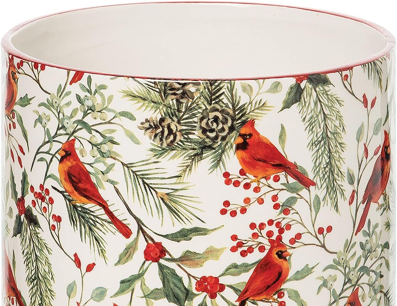 Celebrate the warmth of the holiday season with this Christmas Red Cardinals & Greenery Dolomite Kitchen Utensil Holder. Measuring 7 inches tall, this weighted crock combines festive artistry and practical function, keeping your cooking tools neatly organized while enhancing your countertop décor. The detailed red cardinal motif, surrounded by pine branches and pinecones, captures the beauty of winter nature and brings timeless seasonal charm to your home. Made of durable dolomite, it offers stability and a refined finish that complements both traditional and modern interiors. Perfect for holding spoons, spatulas, and other utensils, it also doubles as a decorative bottle holder or floral vase, offering versatility throughout the year. Whether used in your own kitchen or presented as a thoughtful Christmas gift, this elegant piece adds festive character and a touch of luxury to any space, blending style, function, and enduring quality.