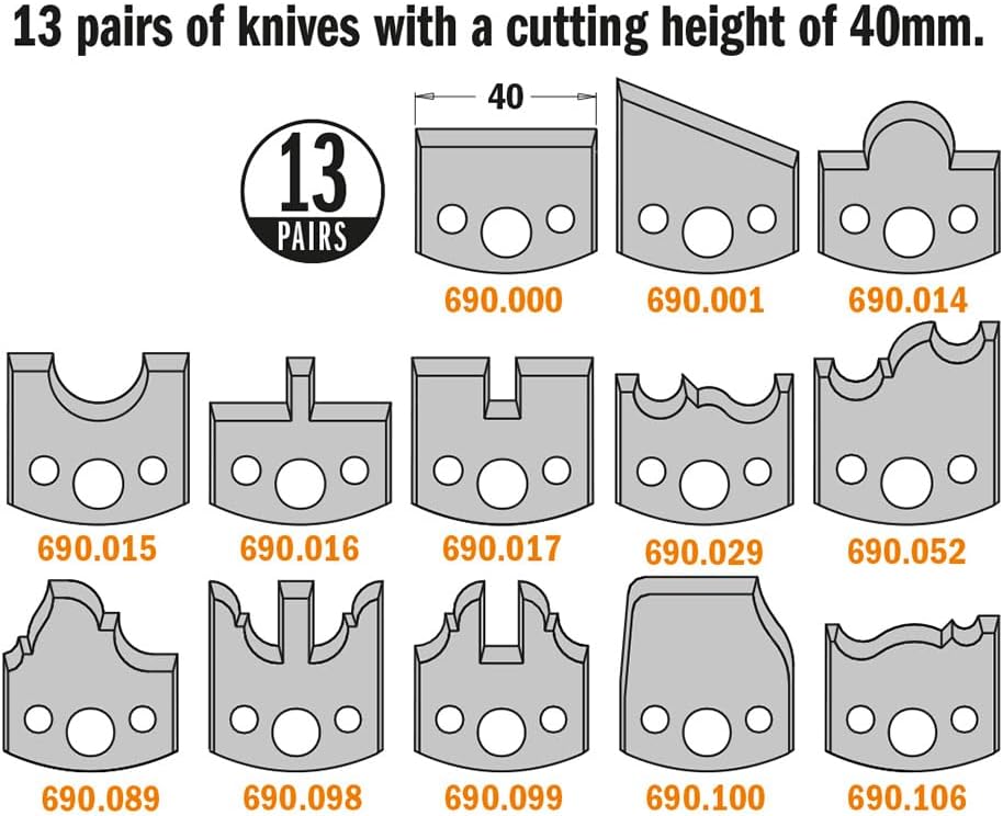Product Description CMT's new Cabinet & Joinery Shaper Set includes 13 profiles that are ideal for the professional woodworker. Selected primarily to make joints and doors, the profiles include raised panel and rail and stile cutters, tongue & groove and cove & bead cutters; plus several beautiful molding profiles. CMT's profiled knives included: 690.000, 690.001, 690.014, 690.015 690.016, 690.017, 690.029, 690.05, 690.089, 690.098, 690.099, 690.100, 690.106. From the Manufacturer CMT's new Molding and Profile Shaper Set includes 13 profiles that provide a great basic selection for almost any decorative molding need. The cutter head accepts any of the dozens of additional profiles available from CMT, so there's no limit to the shapes you can mill. The set includes: Lightweight, aircraft-grade aluminum cutterhead, 13 pairs of M2 steel knives with 40mm cutting height, and molded plastic case