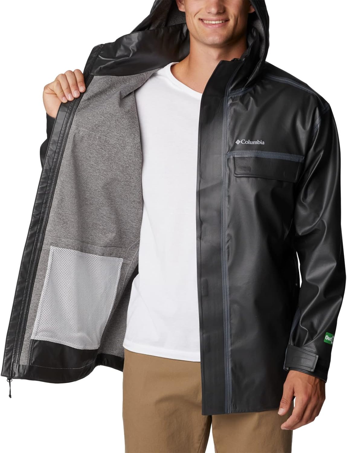 An eco-friendly companion for wet weather, this PFC-free jacket is waterproof, breathable, and seam sealed against heavy rain or snow. It features an OutDry Extreme membrane shell made from 100% recycled fabric and backed by a soft interior lining. The protective hood has a bonded brim and seams, a an adjustable drawcord, and peripheral adjustment. Functional features include a chest pocket, two zippered hand pockets, adjustable cuffs, and a drop tail hem for extra coverage. Columbia offers this jacket in multiple colors and sizes. Extended sizing available. Relaxed Fit.