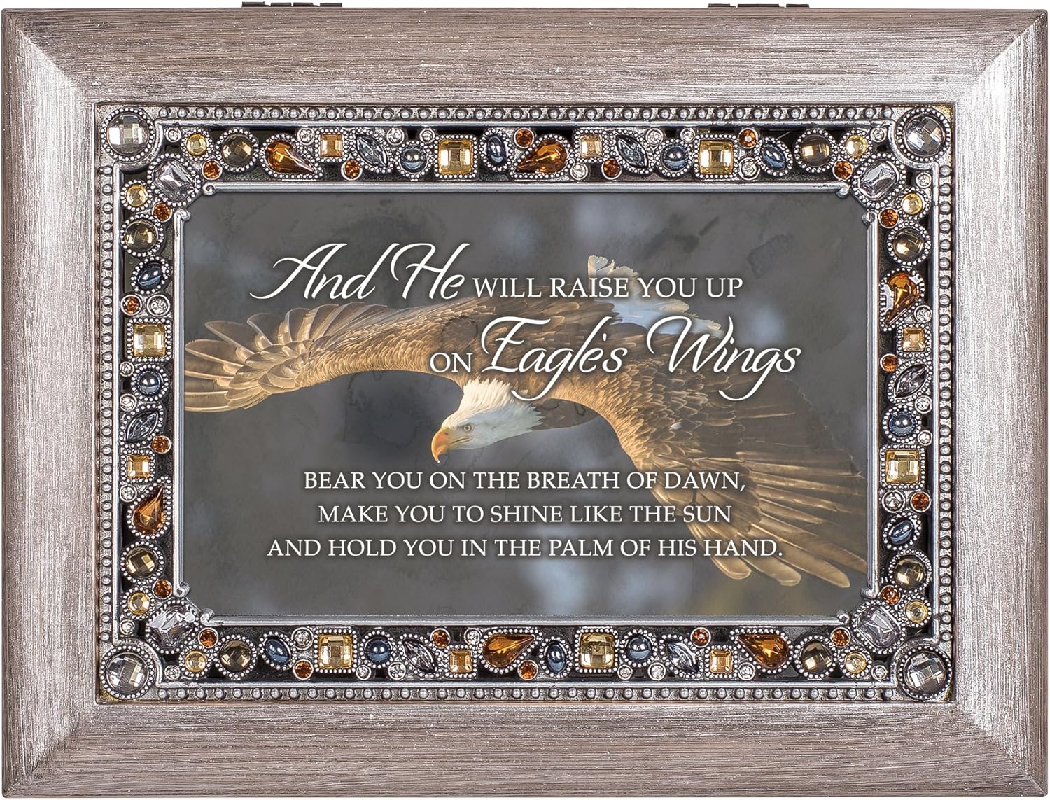 Cottage Garden inspirational and sentimental products are both lovely and classic in style. Be encouraged by a message that reads, "And he will raise you up on eagle's wings, bear you on the breath of dawn, make you to shine like the sun and hold you in the palm of his hand." Designed by artists in the Heartland of America, Cottage Garden’s Collections reach a variety of tastes and have a wide range of occasions for gifting. Beautiful decorative jeweled inlay photo frame lid. Brushed pewter finish. Music box measures approximately 8 x 6 x 2.5 inches; Replace artwork with a 4 x 6 inch personal photo. Traditional wind-up mechanism engages music to play melodic tune On Eagle's Wings. Black velvet lined interior cushions your precious treasures; Decorative bun feet are padded to protect table top and shelf surfaces. Ships in protective packaging; Ready for giving to that special someone.