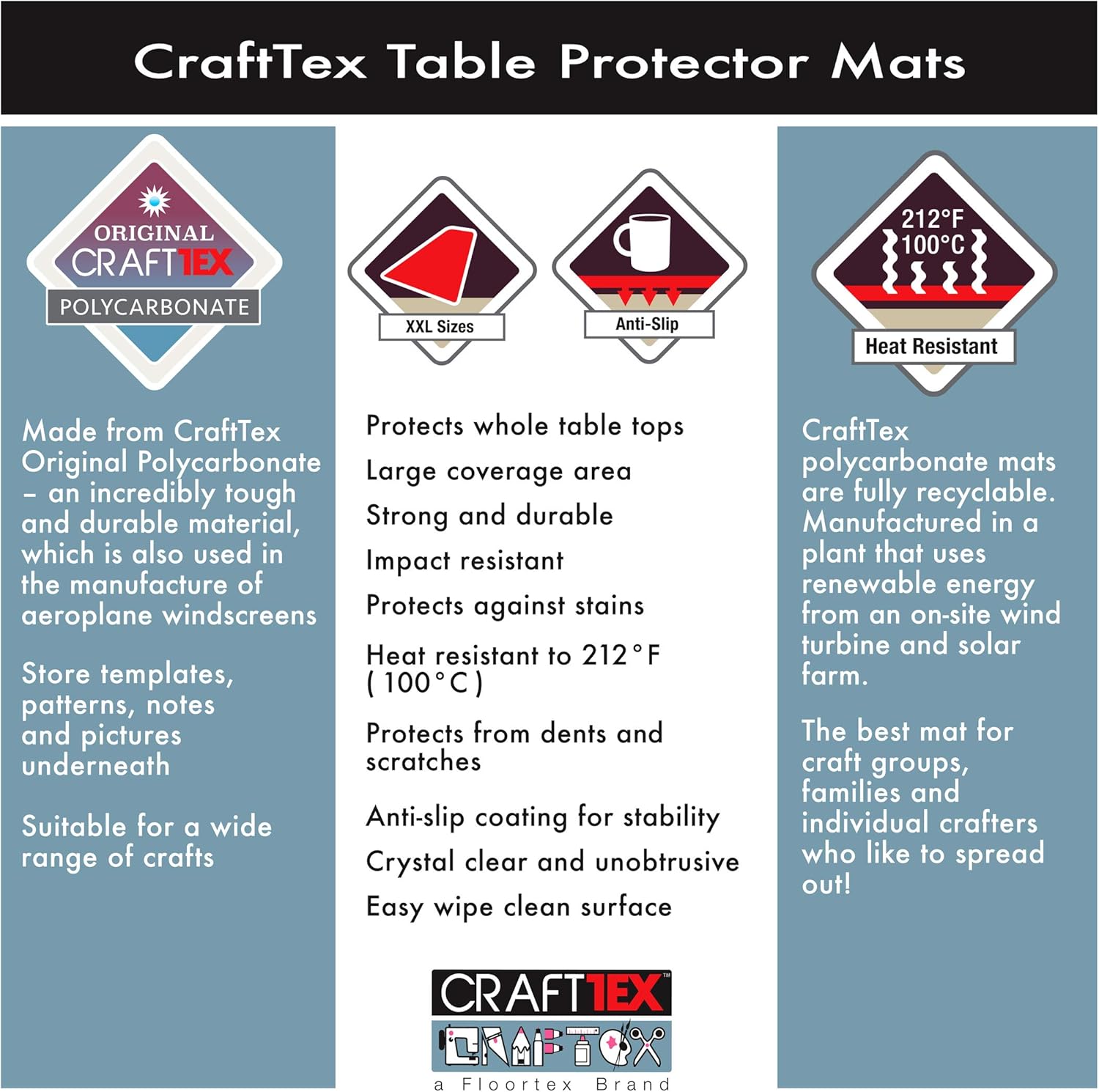 Surface protection mats Designed to keep your tabletop clean and protected - no matter what you throw at it! The super-strong polycarbonate material acts as a barrier to protect against scratches, stains, scuffs and spillages which can occur during craft, art or model-making. Heat resistant up to 212’f with an anti-slip backing. This mat means you can concentrate on crafting, not cleaning!
