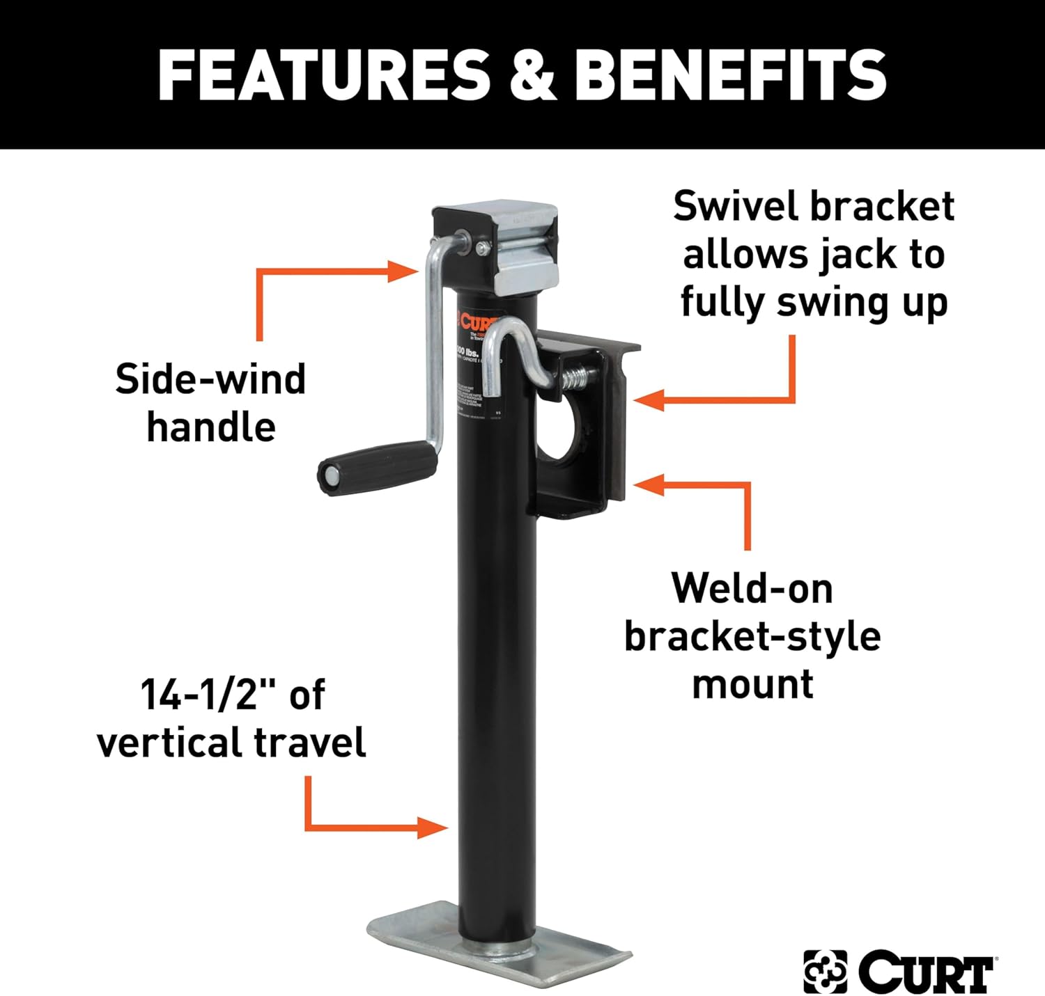 In our goal of being your best source for all things towing, the CURT line of trailer jacks is designed with care and manufactured with pride. CURT jacks are made with quality to promote the life and function of your trailer, and they come in several different styles to accommodate your needs, whether you are a frequenter of the boat landing, the campground, the racetrack or the field. CURT swivel jacks get their name from the pull-pin swivel feature that allows the jack to pivot on its mounting bracket and swing up and out of the way for travel. Our swivel trailer jacks are broken into two categories: pipe mount and bracket mount. This CURT bracket mount swivel jack features a support capacity of 3,000 lbs., a lift capacity of 2,000 lbs. and a travel of 15". With a jack foot plate welded on the bottom, this type of jack provides added stability for your trailer on rough terrain. It comes with a side-wind handle and has a weldable bracket for secure mounting. It does not matter what kind of trailer you tow -- a boat trailer, utility trailer, livestock hauler or recreational vehicle trailer -- if you have a receiver-style trailer, you will want a jack that complements its function. For a trailer jack that will not steer you wrong, CURT has the answer.