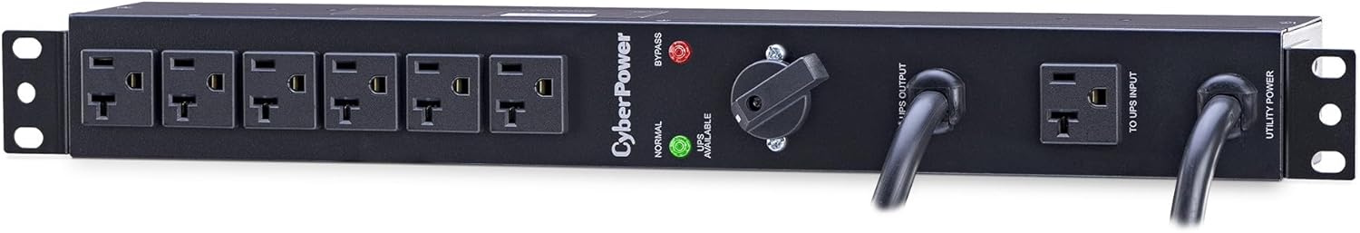 The CyberPower MBP20A6, a 6-outlet (rear), 1U Maintenance Bypass Power Distribution Unit (MBP PDU), provides 100-120 VAC 20A output (derated to 16A) to 6 NEMA 5-20R receptacles. Designed for datacenters and other electrically demanding applications, the MBP20A6 allows the seamless transfer of an electrical load from UPS power to utility power for uninterrupted operation of connected equipment when performing maintenance, replacing batteries, or installing a new UPS. A 6-foot AC cord connects to utility power; a 3.3-foot AC cord connects to the output power of the UPS. The UPS draws input power from the MBP20A6 through a dedicated NEMA 5-20R separate from the outlets for connected devices. When the switch on the front of the MBP20A6 is turned from Normal to Bypass, or from Bypass to Normal, the power that the MBP supplies to connected devices moves from one input power source to another. The LED display indicates which power source is active. Rugged, industrial-grade metal housing protects the MBP20A6. With a 1U form factor, this PDU can be mounted in a standard server rack. Its mounting hardware also enables it to be connected to a UPS for tower configurations. The MBP20A6 is UL and RoHS compliant. A three-year limited warranty covers the PDU for three years and connected equipment for as long as you own the product.