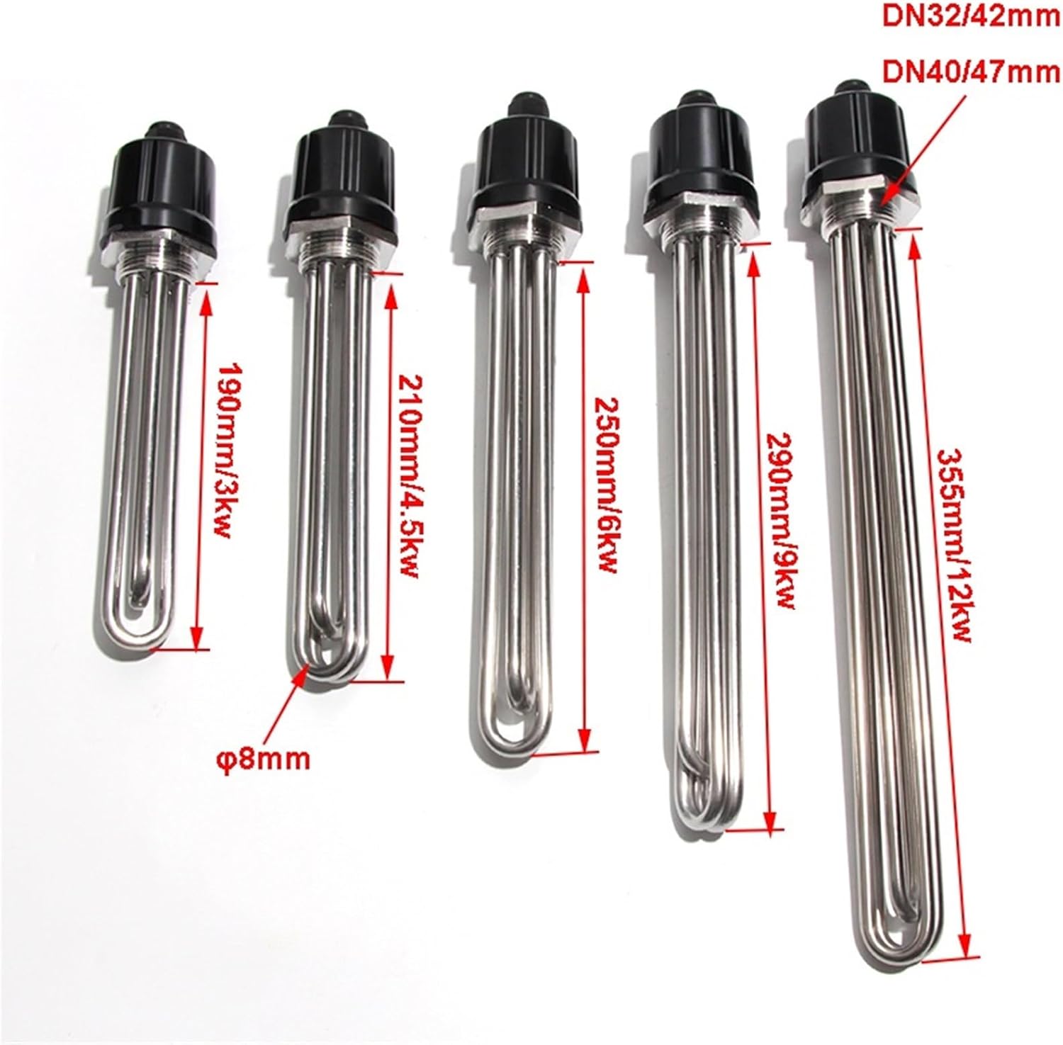 Heating ElementsDN32/DN40 Water Imersion Heating Equipment 110V 220V 380V 304 SUS Solar Heater Element 3KW-12KW for Swimmming Pool1. Tube Material: 304SS2. Voltage: 220v / 380v3. Wattage: 3kw / 4.5kw / 6kw / 9kw / 12kw4. Tube length: 190mm / 210mm / 250mm / 290mm / 355mm5. Thread: DN32(42mm) / DN40(47mm)6. Tube diameter:8mm(DN32 / DN40);10mm(DN50)7. Package:1pc heating element + 1pc gasket + 1pc cover==========Electric : NoHigh-concerned chemical : NoneType : Electric Water Heater PartsProduct Name : Hexagonal threaded electric heating pipeThread Size : DN32(G1.25) DN40(G1.5)Tube Material : 304SSVoltage : 110V/220V/380VWattage : 3KW4.5KW6KW9KW12KWApplication : Boiler heater, tank heater, mold heaterCertificate : , ROSH, LVDAccept Custom Made : YESThread Material : Stainless steel