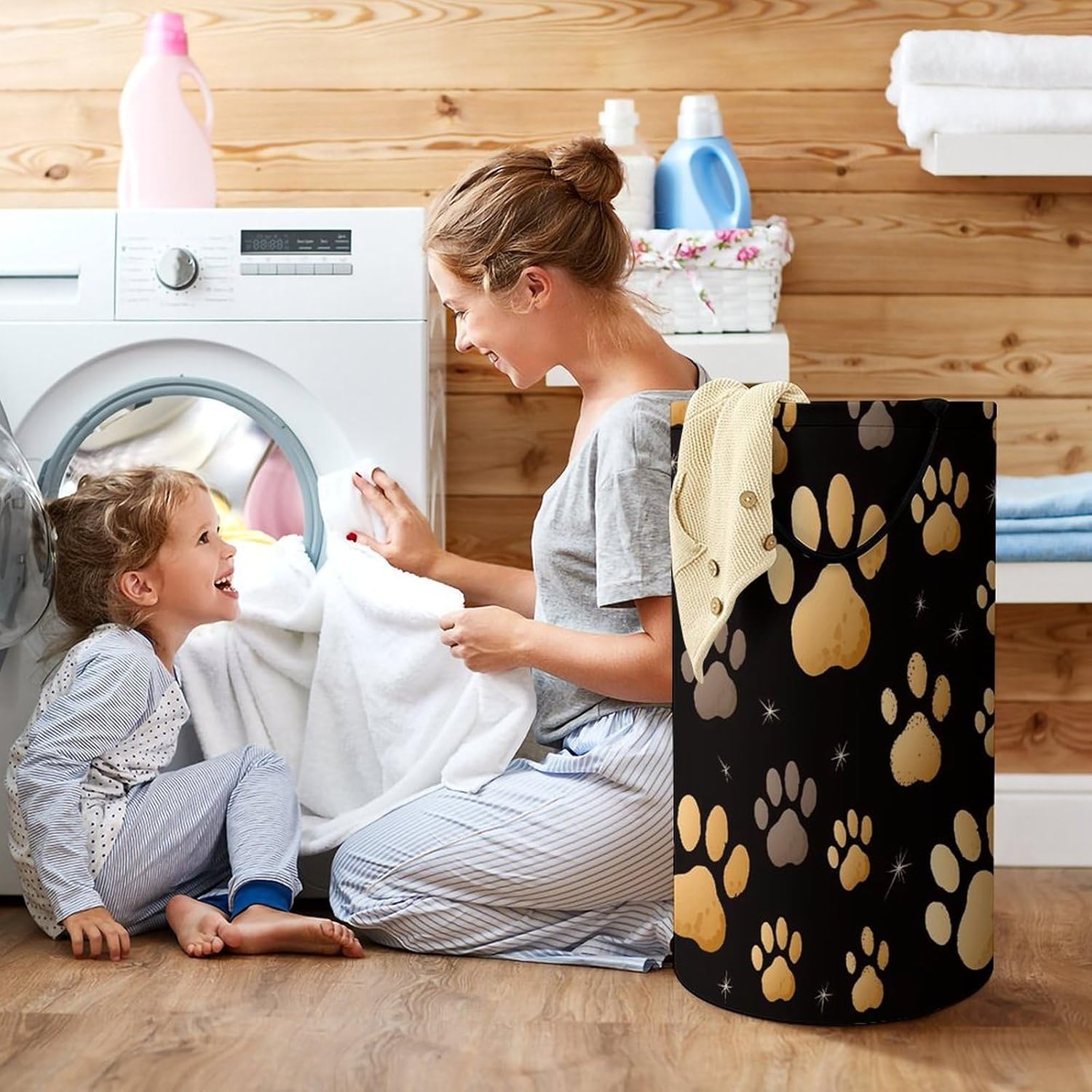 The pattern of the Dog Paw Print hamper is printed with exquisite patterns, which makes the product more attractive.Chic design allows it to be used in the living room to hold throw blanket, pillows, and reading materials, as well as in the bathroom for towels, or as a laundry hamper.The laundry hamper adopted collapsible design, equipped with handles. It is lightweight and portable for using, storing, and moving conveniently.Dog Paw Print Clothes hamper is suitable to store dirty clothes washing, place in the room to store toys, and other household goods, keep the house clean and tidy. Perfect laundry hamper for home, office, closet organizer, bedroom, bathroom, college dorm, etc.Gets out of your way when you need it to. This storage basket or laundry hamper is a good gift, which not only meets everyday storage needs but also carries deep care and love, a perfect way to turn thoughtfulness into warmth.
