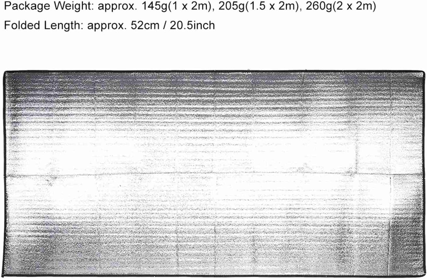 Double-Sided Aluminum EVA Mat, Foldable Moistureproof Camping Pad, Portable Sleeping Mattress for Outdoor, Picnic, Car Windshield CoverDescription:Our camping mat is made of aluminum foil and EVA, safety, durable and environmental friendly. Double-side moistureproof mat prevent you from the cold and damp ground, helps you to sleep comfortably and protects your belongings from dust. It's lightweight, foldable and easy to carry, perfect for camping, picnic and other outdoor activities.Features:1. Made of aluminum foil and EVA, it's safety, durable and environmental friendly.2. Double-side moistureproof mat protects you from damp grass, sand and offer you comfortable rest when you go out.3. Light, foldable and equipped with a carry bag for easy storage and portability.4. A necessity for camping, picnic and other outdoor activities also perfect for children to play on it.5. With a good heat insulation, can be served as an insulator at the car windshield in summer. Specifications:Material: Aluminum Foil + EVAColor: SilverSize: approx. 1 x 2m / 39.4 x 78.8inch, 1.5 x 2m / 59.1 x 78.8inch, 2 x 2m / 78.8 x 78.8inch(Optional)Package Weight: approx. 145g(1 x 2m), 205g(1.5 x 2m), 260g(2 x 2m)Folded Length: approx. 52cm / 20.5inchType: Camping MatQuantity: 1pc Camping MatPackage Included:1 x Camping MatNote:1. Please allow 1-3cm error due to manual measurement. Thanks for your understanding.2. Monitors are not calibrated same, item color displayed in photos may be showing slightly different from the real object. Please take the real one as standard.Package List:1 x Camping Mat