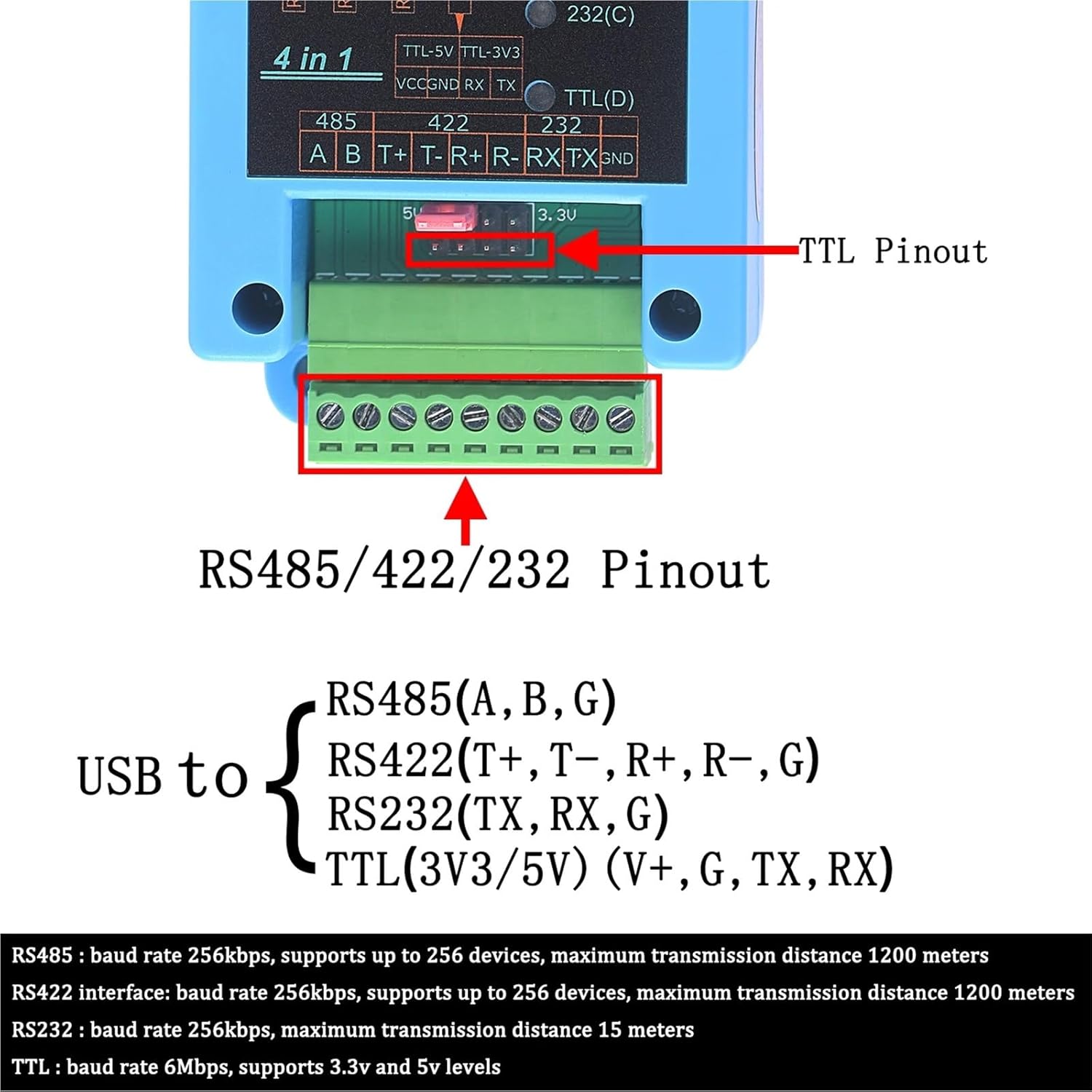 Cables==========USB to RS232 232 RS485 485 RS422 422 TTL(3V3/5V) Serial Adapter Converter 4 in 1Model Number : 000768Type : Cable AdapterChipset: : CH344Length : 1.5M