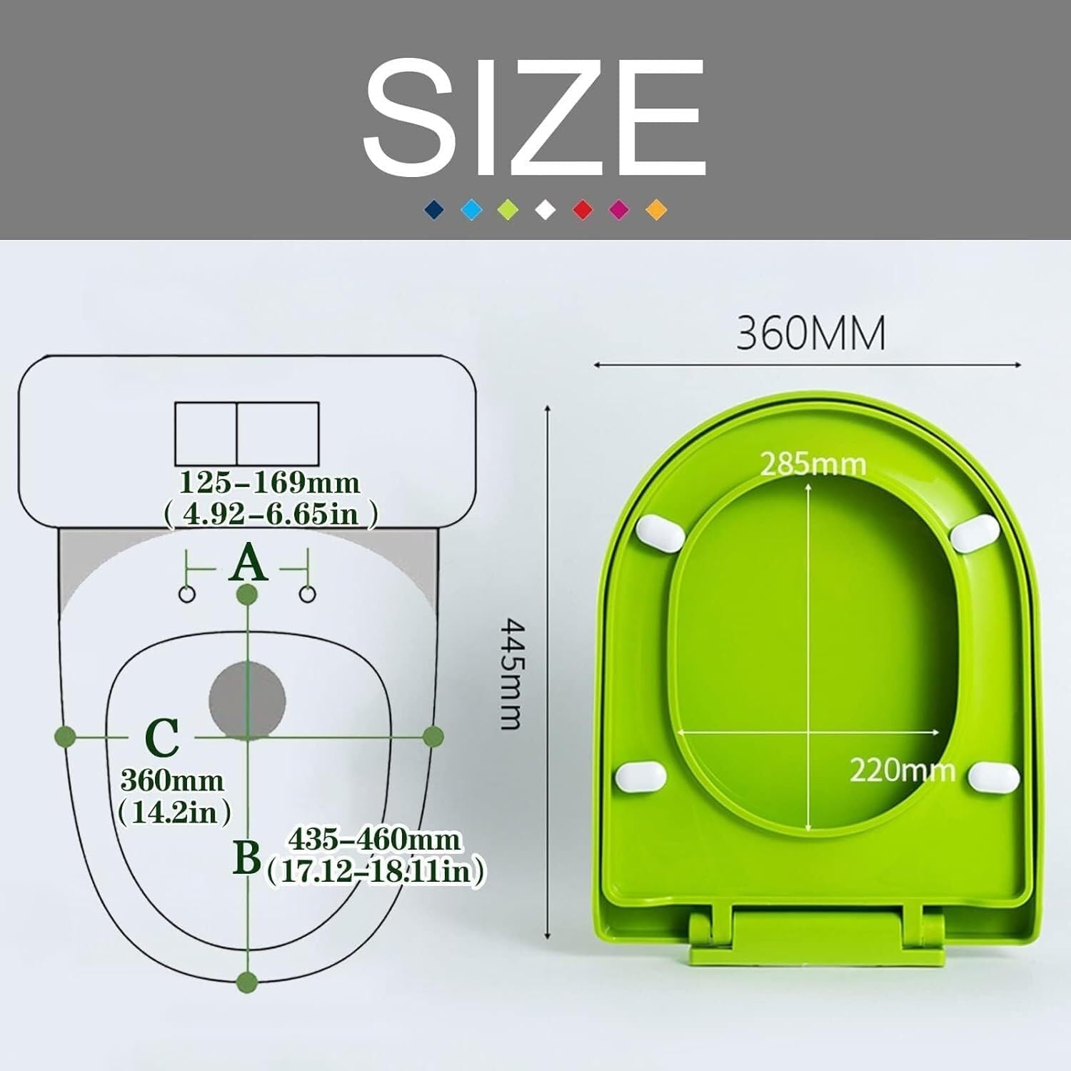 U Shape Toilet Seat Cover 1 x U Shape toilet seat 1 x plastic base Size: 360*445mm U shaped Toilet Seat Size - total dimensions (L x W x H): 445 x 360 x 5 cm weight: approx. 2.1 kg. Material is duroplast U shape toilet seat Colored: Blue Green Orange Purple Red Sapphire. Soft-Close hinge: soft close function quietly without striking gives you an appropriate and quiet life. Easy installation - quick and easy installation with the supplied assembly material quick release with button Easy to clean: Quick lock and upper fastening can be cleaned slightly at any time.