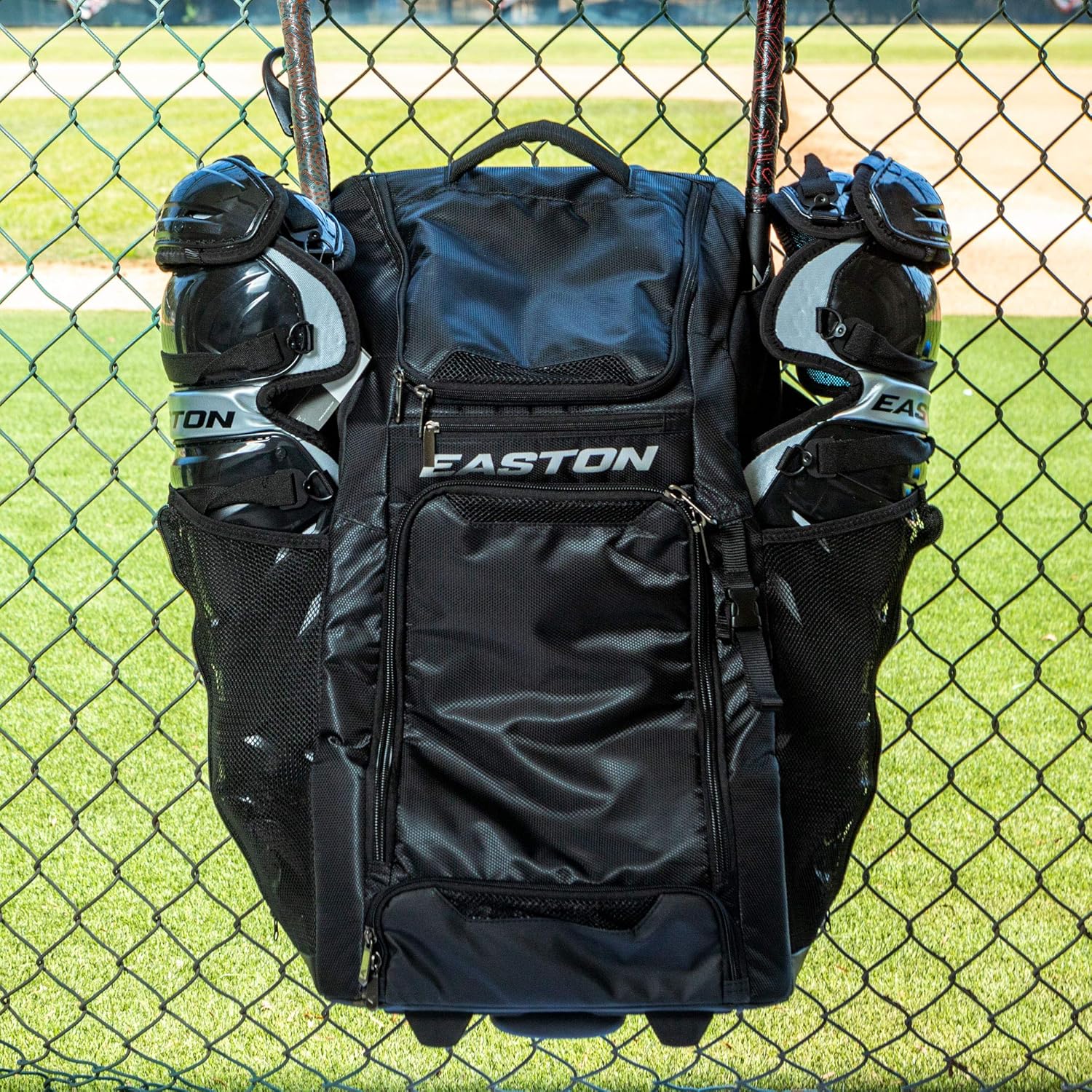 Easton's Catcher's Wheeled Bag boasts a rigid base and back, equipped with a telescopic handle. It offers two expandable side sleeves for leg guards, three mesh-vented compartments for breathability, and a felt-lined personal pocket. The bag includes two detachable internal shelves for organization, two fully-lined bat sleeves with integrated fence hooks, and rugged inline wheels. It also features external straps with quick-release buckles for gloves or helmets, an internal mesh pocket with hook and loop for batting gloves, and a small removable bag for personal items.