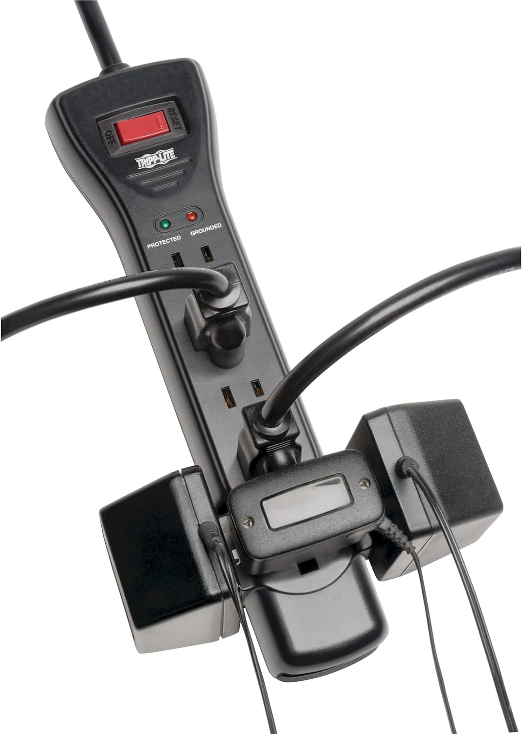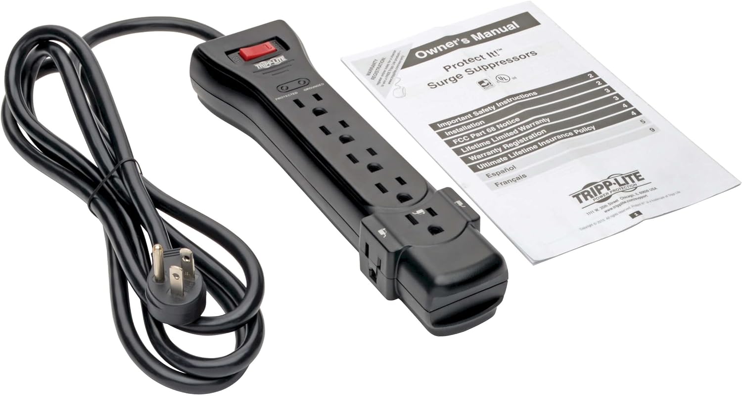 SUPER7B Flat Plug Power Strip Surge Protection The Tripp Lite Protect It!® SUPER7B is a premium 7-outlet surge protector engineered to shield your electronics from damaging power surges and line noise. With a powerful 2160-joule suppression rating, it’s ideal for safeguarding computers, printers, routers, and other sensitive devices in home or office environments. Design and Connectivity Featuring seven NEMA 5-15R outlets, including three spaced for bulky transformers and two side-mounted for added flexibility, the SUPER7B ensures convenient access and efficient use of space. Its 7-foot AC power cord with a right-angle plug allows furniture to sit flush against the wall, optimizing your workstation layout. Safety and Performance The SUPER7B offers comprehensive protection across all three residential power wires—hot, neutral, and ground—covering both normal mode (H-N) and common mode (N-G/H-G) surge events. Features a Let Through Rating (also known as clamping voltage) of 330/400/400. It also filters out disruptive EMI/RFI interference that can degrade performance or cause data loss. A built-in 15A circuit breaker prevents overloads, while diagnostic LEDs provide real-time status on grounding and protection. Compliance and Certification This surge protector is UL Listed and certified (UL 1449 3rd Edition), meeting rigorous safety standards for reliable operation. It also exceeds IEEE 587 Category A and B surge suppression specifications, ensuring robust defense against even the most severe electrical disturbances. Convenience and Assurance The unit includes a one-touch power switch and keyhole slots for wall or desk mounting. Its durable black housing complements any setup. Backed by a Lifetime Limited Warranty and $75,000 Ultimate Lifetime Insurance, the SUPER7B delivers long-term peace of mind and dependable protection.