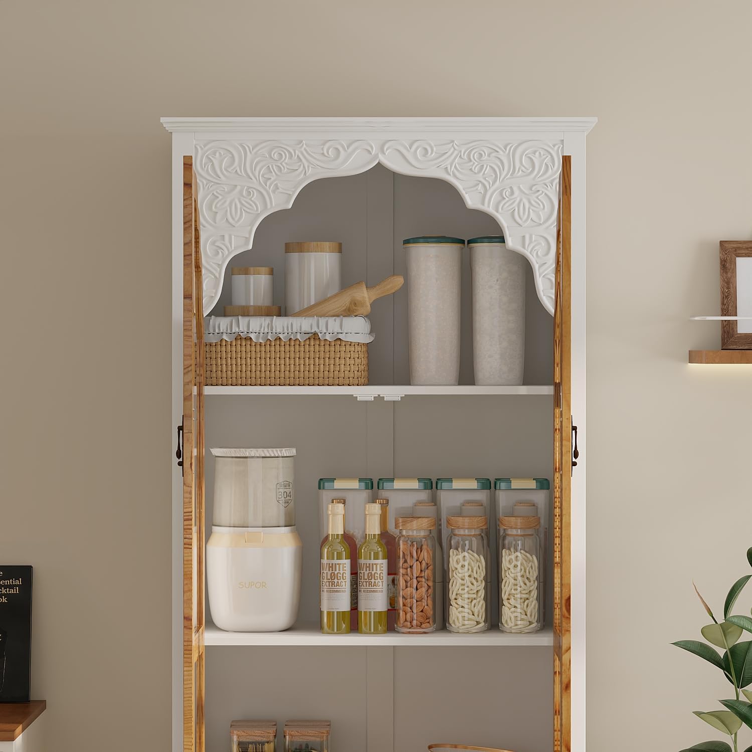 Keep your kitchen supplies organized with the ECACAD carved kitchen pantry. Its 3-tier shelves and 2 glass doors provide ample storage space for spices, utensils, and more. It's durable and easy to maintain, ideal for dining room, Kitchen & living room.