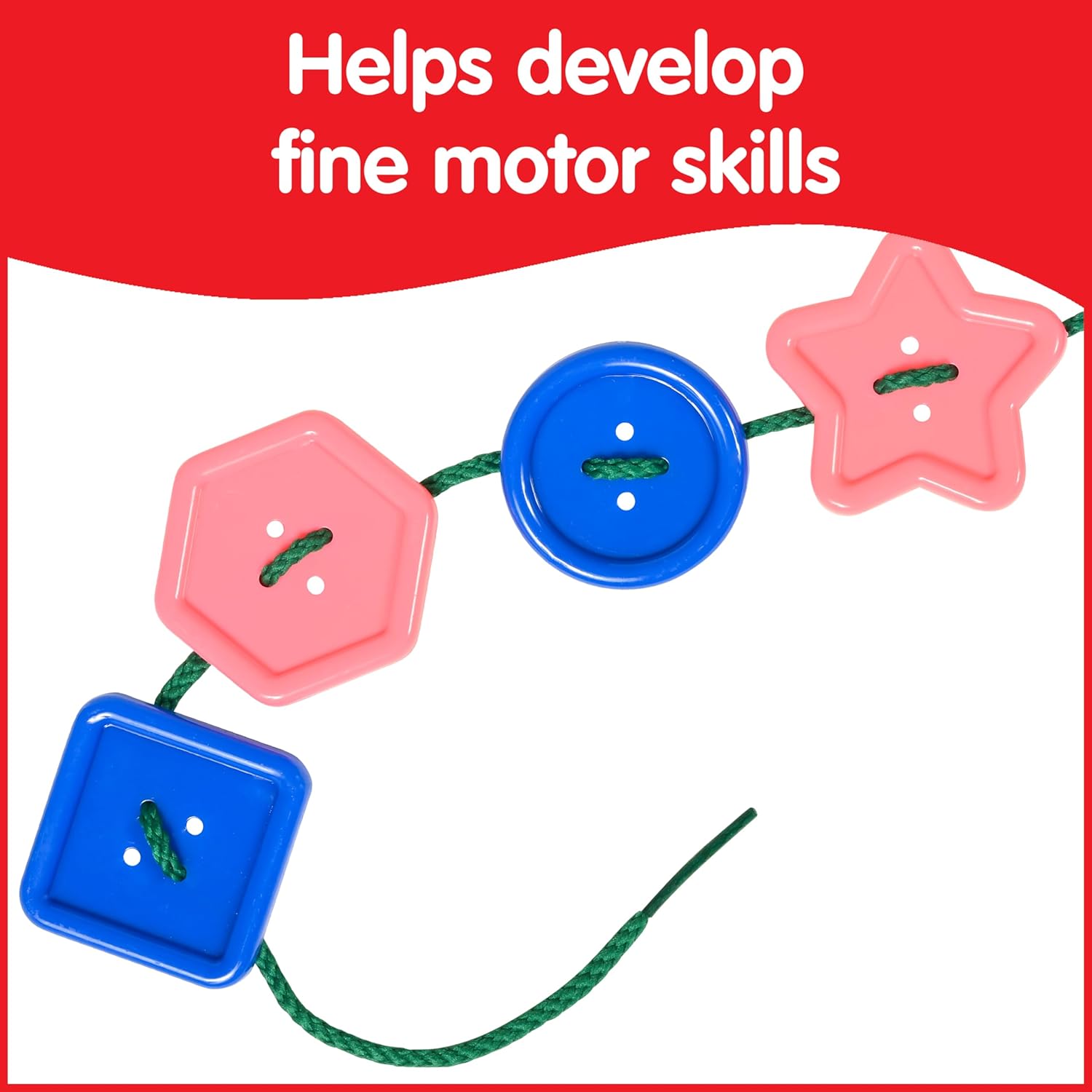 Develop early math skills by weaving these buttons onto the laces provided. Great for fine motor development, sequencing activities and encouraging creativity. Strengthen dexterity, hand-eye coordination and the pincer grasp with this colorful lacing activity. Use the included activity guide for ideas on how to build fine motor and early math skills with these buttons. These colorful buttons are an ideal size for small hands to grasp. Each pack includes 0.5 lb. of large, 1.5"-2" buttons, conveniently packaged in a storage jar with lid and carry handle.
