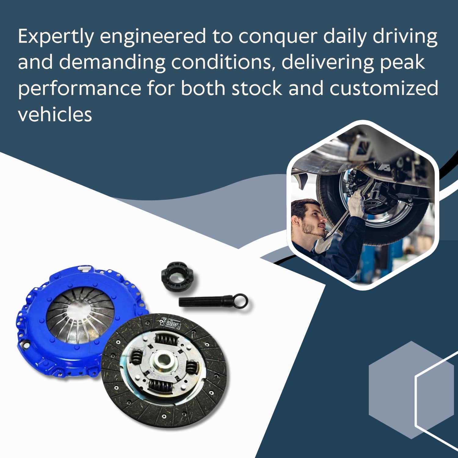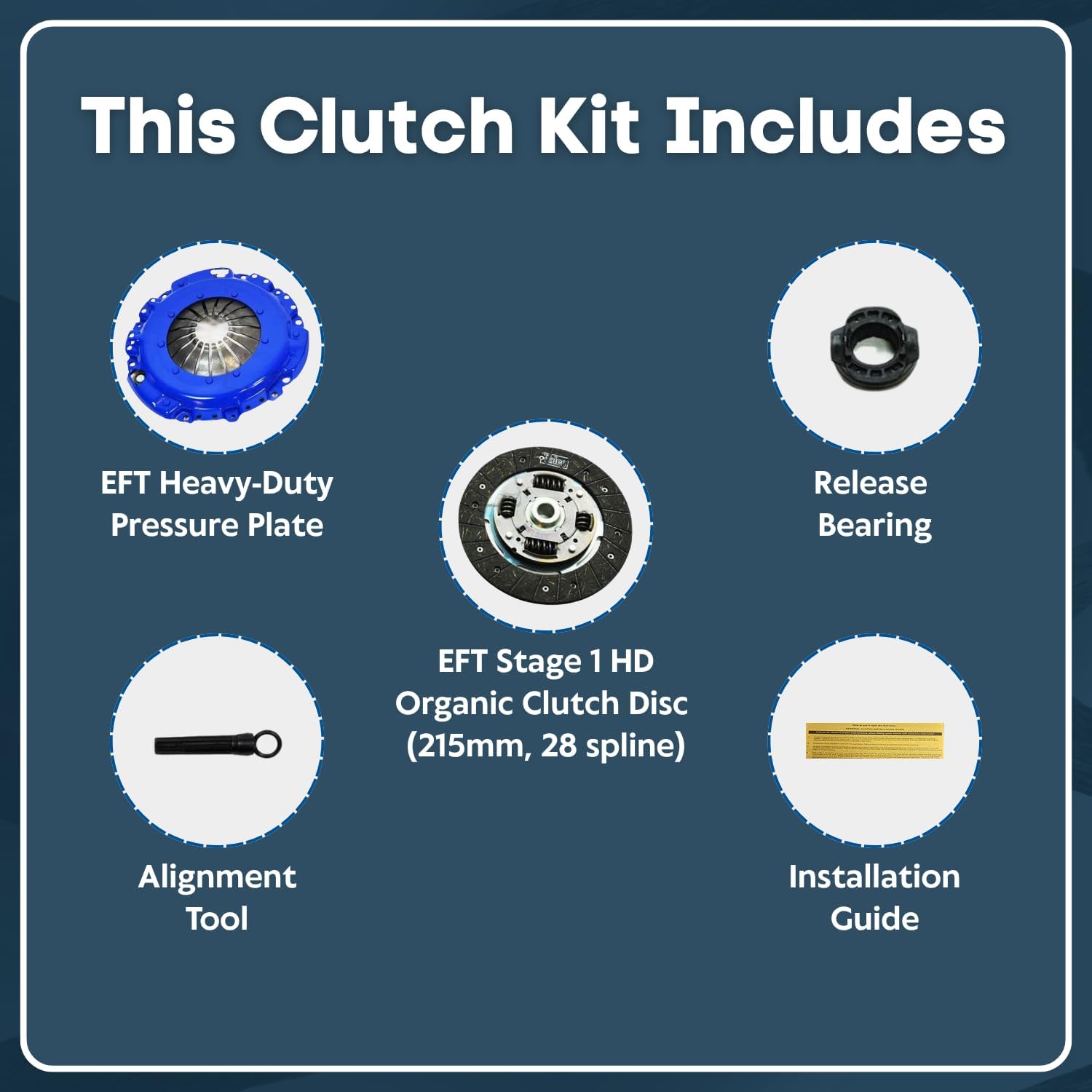 EFT Stage 1 clutch kit is an upgrade heavy-duty clutch set up for those who seeks streetable high performance clutch. It is a direct factory replacement parts thus no modifications are needed. The clutch kit includes only the highest grade components and it's ready for hot action on street and track. The premium organic friction material for high heat tolerance, quick recovery, good friction and long life. The heavy-duty sprung center unit boasts heat treated springs and retainer rivets for the maximum power and durability. The EFT pressure plate features special single diaphragm design to increase clamp load. It features induction hardened diaphragm, CNC machined castings, stronger drive straps and rivets. EFT pressure plate provides smooth and precise feel with easy modulation. All EFT pressure plate is load tested on a special testing tool for quality assurance.This complete clutch kit includes:-EFT Heavy-Duty Pressure Plate-EFT Stage 1 HD Organic Clutch Disc (215mm, 28 spline)-Release Bearing-Alignment Tool-Installation Guide Vehicle ApplicationFits 1998 - 2005 Volkswagen Beetle (2.0L 4cyl Gasoline)Fits 1999 - 1999 Volkswagen Golf (2.0L 4cyl Gasoline; fits MK4 model with AEG engine only)Fits 2000 - 2006 Volkswagen Golf (2.0L 4cyl Gasoline; fits MK4 model only)Fits 1999 - 1999 Volkswagen Jetta (2.0L 4cyl Gasoline; fits MK4 model with AEG engine only)Fits 2000 - 2005 Volkswagen Jetta (2.0L 4cyl Gasoline; fits MK4 model only)