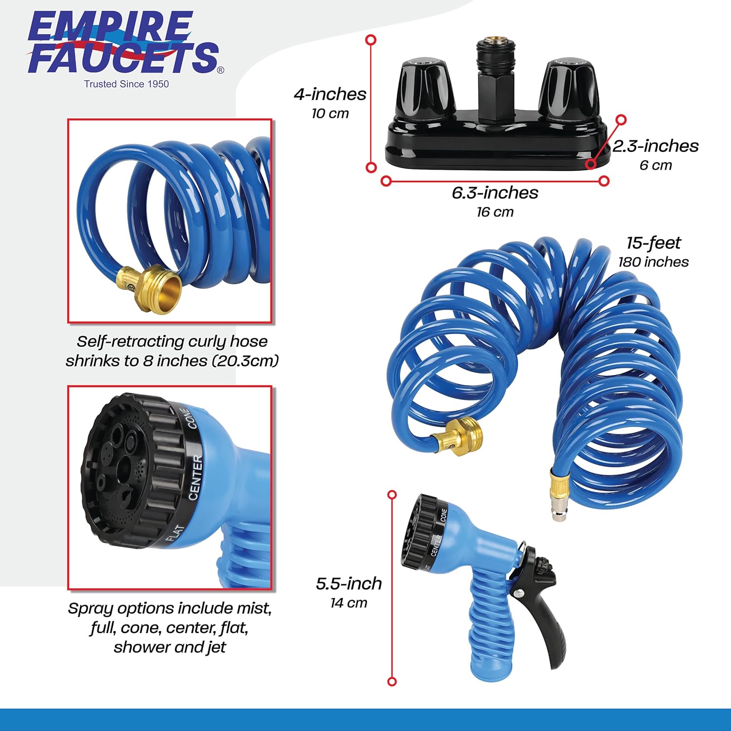 | Included Components | Empire Faucets CRD-BKQDC5-15CHSPRY RV Potable Water Hose Set - 15' Coil Hose with 4" Black Quick Disconnect and 7-Function Sprayer |