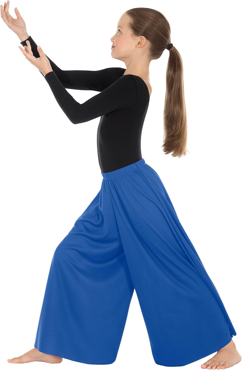These polyester pants are a must have in any dancer's wardrobe. With the flattering wide leg and elastic waist, these palazzo pants are for every dancer. Can be cut as needed to adjust length. No hemming is required.