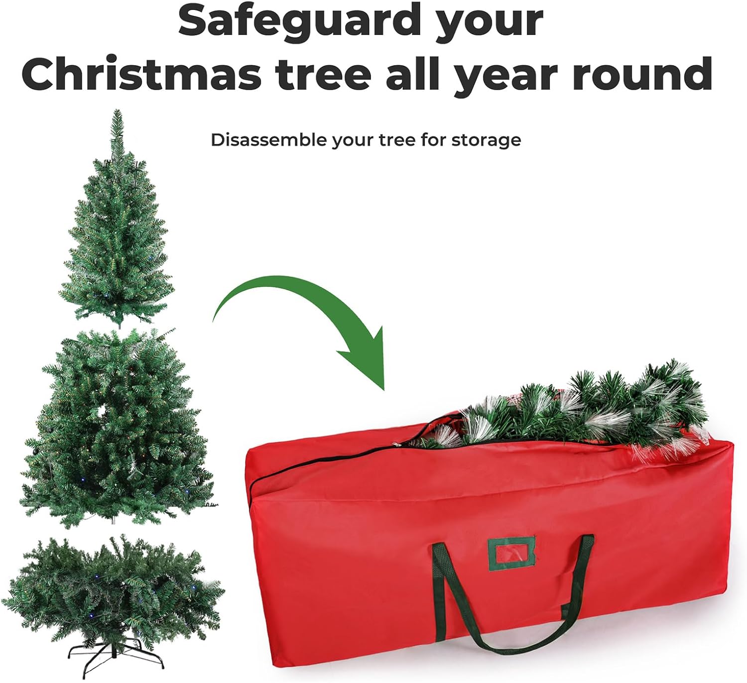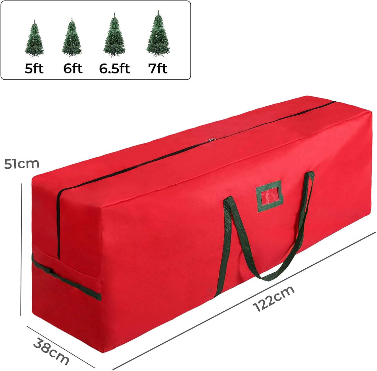 Keep your artificial Christmas tree protected and organized with this premium storage bag designed for trees ranging from 1.5m to 2.1m. Made from heavy-duty 600D Oxford fabric, this durable bag can handle up to 30kg, ensuring your tree stays secure and intact year after year. It provides ample space while maintaining a compact and manageable design.Featuring a sturdy zipper, reinforced handles for effortless carrying, and a convenient card slot for easy labeling, this red/green storage bag is both functional and stylish. The material’s robust construction safeguards against dust, moisture, and damage, making it ideal for long-term storage. Simplify your post-holiday cleanup and ensure your tree is ready for next season with this reliable and durable storage solution.Key FeaturesExtra large Christmas tree storage bagDurable double-layer 600D Oxford fabricSturdy double zipperReinforced handlesProtects against dust, insects and moistureFits up to 2.1M xmas disassembled treesFoldable and easy to storeIdeal for long-term storageSpecificationMaterials: 600D Oxford fabricLoad bearing: 30kgDimension (L x W x H): 122cm x 38cm x 51cmColour: RedPacking Content1x Christmas Tree Storage Bag