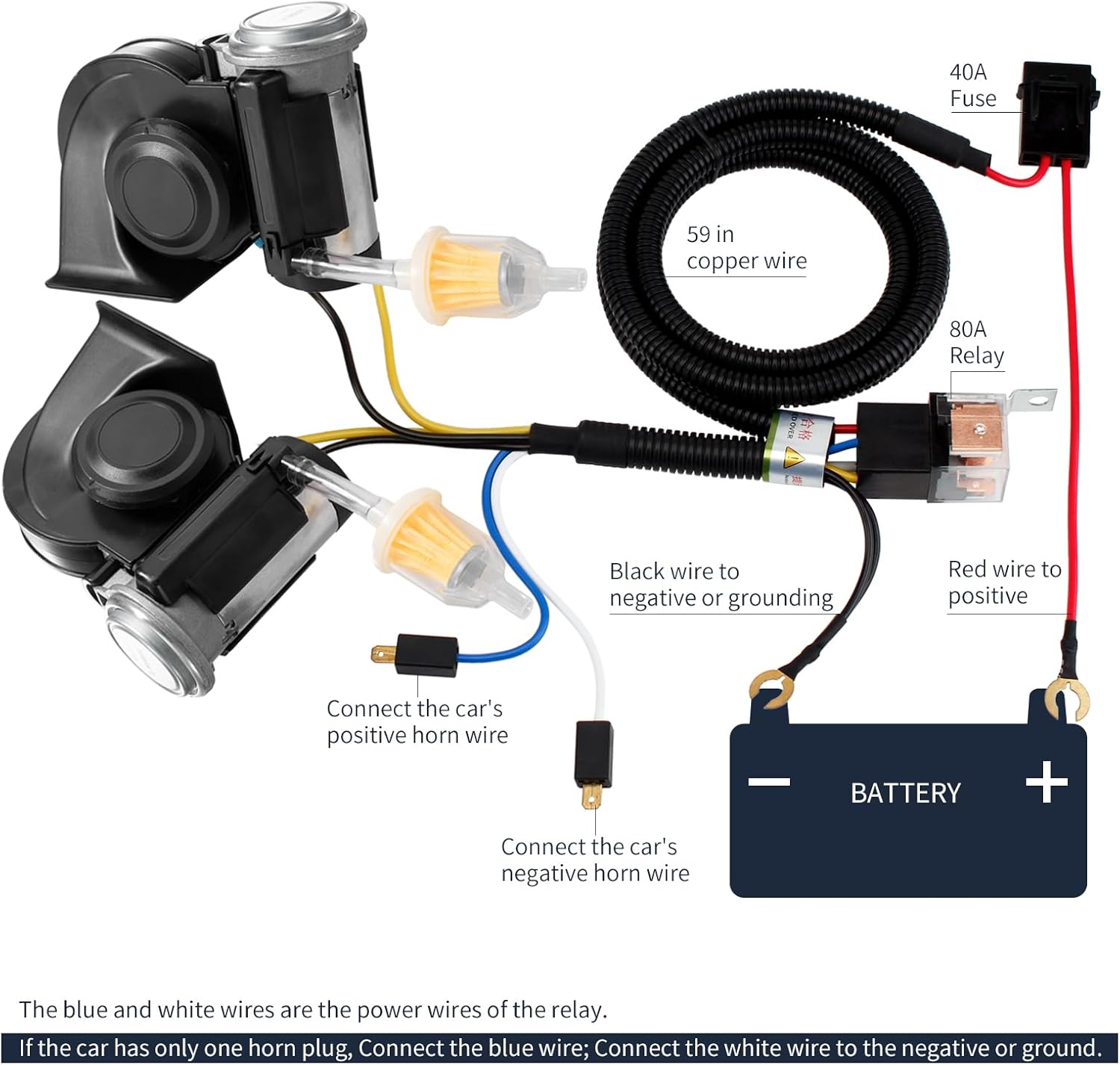 | Included Components | 2 Air Horns, 1 Wiring Harness, 1 Button, 1 Filter, Other Accessory |
