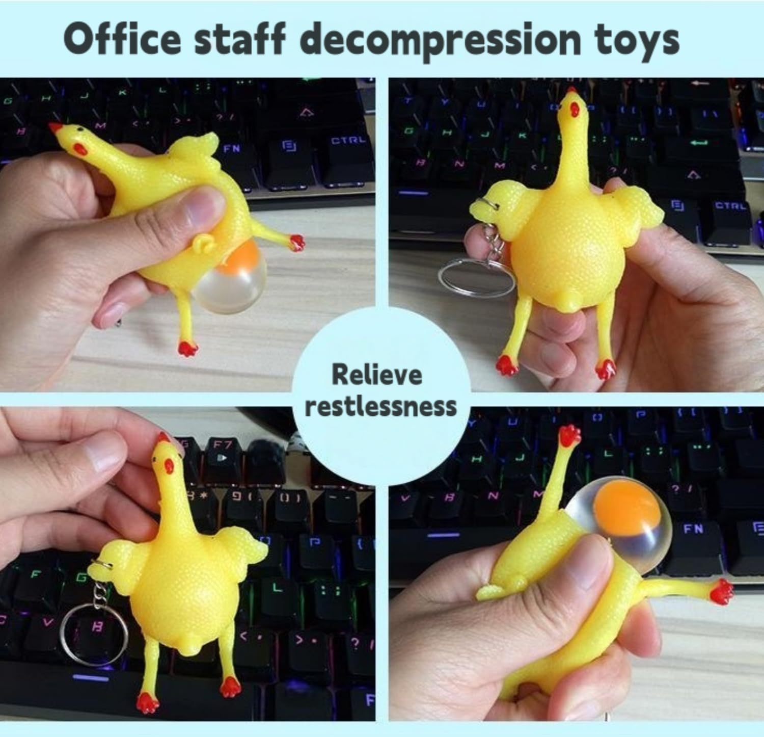 Do you always want to find something to pinch in a busy office or a tense exam? Chickens squeeze eggs and toys come for you! This is not only a keyboard fiddle, but also an emotional regulator who is always with you. When you feel stressed, just gently pinch this lovely chicken and a soft "egg" will pop up immediately. Repeated pressing and rebounding actions can quickly calm your anxious nerves. It is small and light, and it is inseparable from you through the key chain. Whether you are nervous in a meeting or bored in a queue, laying eggs by chickens can help you "squeeze out" negative energy. Use durable and safe materials without fear of damage or fading. Take this fun chicken home and make decompression more interesting!