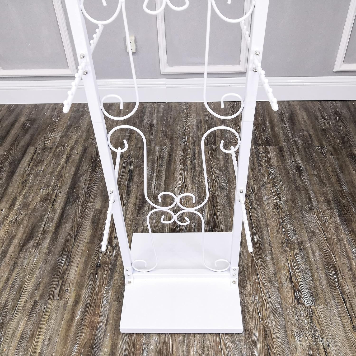 Featuring a double-sided design, this decorative display stand boasts 12 extended hooks with five metal ball stoppers on each, allowing for five hanging positions per hook. Specifically designed for clothing stores, jewelry shops, and handbag/purse retailers, this rack serves as an ideal display solution for showcasing various products effectively. Its ornate design makes it suitable for both commercial and home settings, offering versatility and aesthetic appeal. It ships knocked down for easy assembly. Constructed from steel and powder-coated white, the stand's specifications include a total width x depth x height of 15.7" x 15.7" x 57.6". With its easy assembly process and durable material, this display stand presents a practical and visually appealing option for showcasing merchandise in different retail environments.