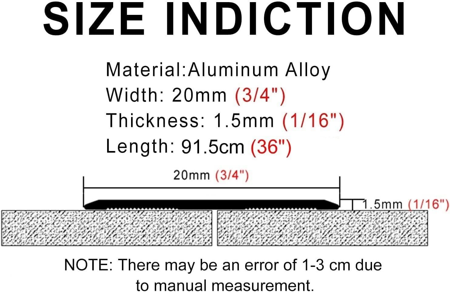 ◆ Aluminum alloy transition strips, cover the seams or gaps between two floor surfaces and protect the edges of the floor and yourself, suitable for floor, room entry ways or other locations. Beneficial to protect children or the elderly, and is not easy to trip, make your home nice and safe.◆ Specification:- Material: Aluminum Alloy- Width: 20mm (3/4")- Thickness: 1.5mm (1/16)- Length: 91.5cm (36")- Suitable for gap with width less than 1cm- Max Load: 250 kg/550 lbs- Cuttable◆ Package List:- 1 x 91.5cm Aluminum Alloy Transition Strip ◆ Features: - Aluminum Alloy Flooring Transition Strips- No Nails/ Screws Needed- Easy to Clean & Not Easy to TripEdge Trimming DecorationWithstand High Foot Traffic◆ Note:- There may be an error of 1-3 cm due to manual measurement.- There may be chromatic aberration due to the difference between the recording lamp and the display. Please refer to the actual product.◆ Quality Service:- When you encounter any problems with our products, please feel free to contact us, and we will try our best to solve them for you. If you leave a message in the review or feedback, we can't find it in time and solve, you can tell us by message. Thanks!