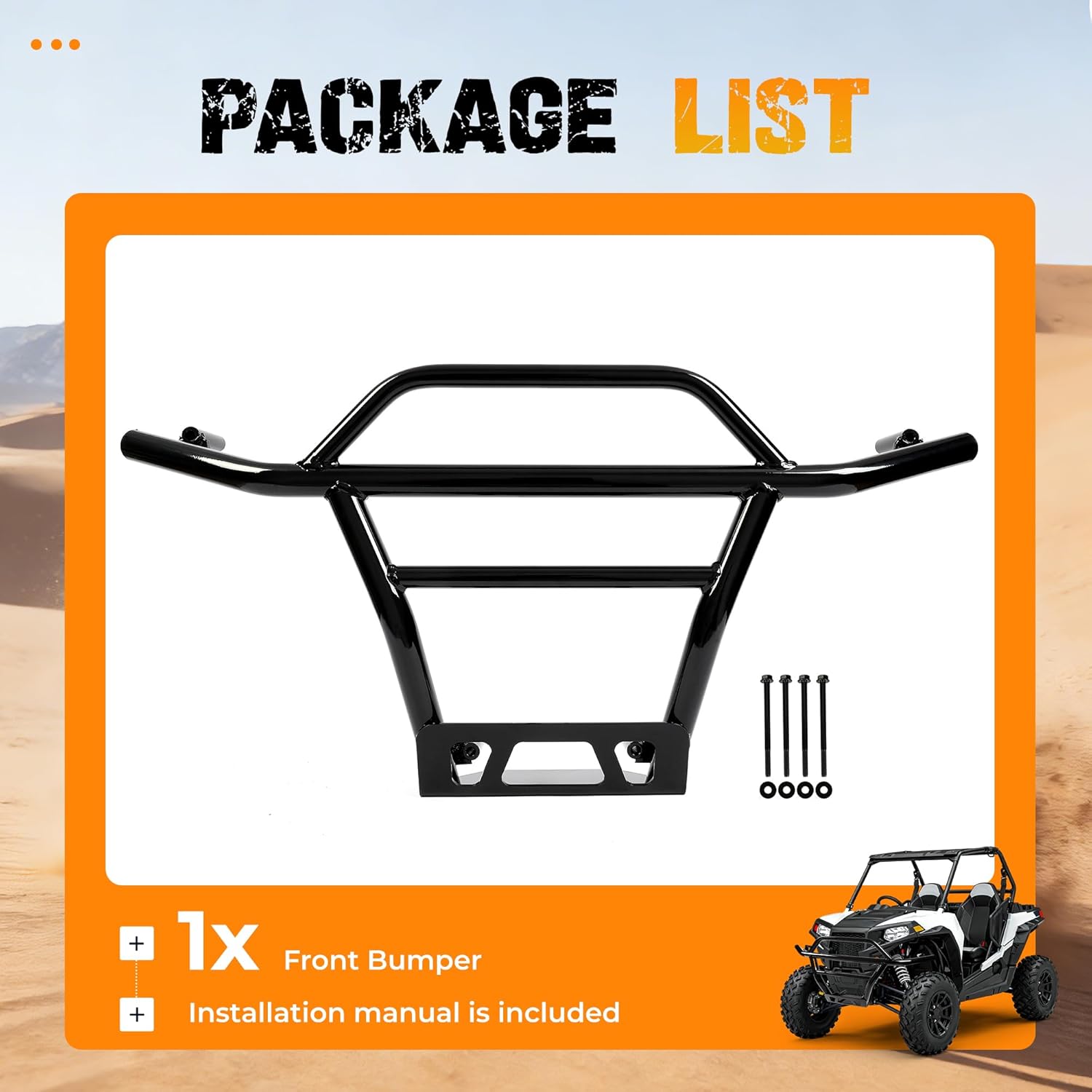 Compatibility: Compatible with 2009-2020 Polaris RZR 170, with precision engineering to align with the vehicle's body lines. Direct replacement for 2877813 Multiple Practical Functions: Effectively reduces damage to the vehicle body, providing reliable protection for the front end; the powder-coated surface enhances rust resistance, adapting to various environments; the unique design add a personalized style to the RZR 170, enhancing the overall appearance Heavy Duty: Constructed from high-strength, thickened steel, produced in strict accordance with standards to ensure a stable structure and impact resistance, extending use life and providing long-term protection for the vehicle Product Specifications: Material: Steel; Color: Black; Surface Finish: Powder-coated. All parameters meet the vehicle's adaptation requirements Convenient Installation Process: Directly bolt on, without additional drilling, saving time and effort. A detailed installation manual is included in the package with clear and easy-to-understand steps for quick completion. For installation accuracy , professional installation is recommended