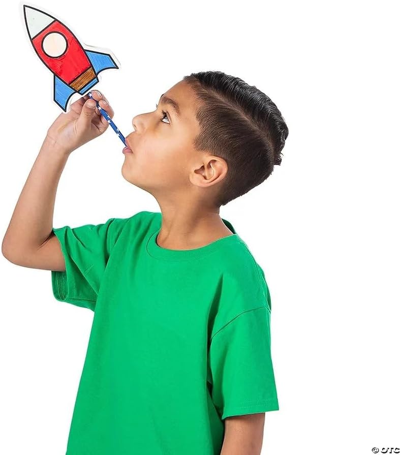 "Blast off into creative learning with the Fun Express STEM Color Your Own Air Rocket Craft Kit! This engaging educational toy combines the excitement of space exploration with hands-on arts and crafts for kids, making it the perfect activity for young astronauts ages 3-8. Each kit makes 10 complete air rockets, providing hours of entertainment for classrooms, birthday parties, or family craft time. Children will love coloring their own unique rocket ship designs before assembling them with the included self-adhesive foam shapes. The magic happens when kids blow into the paper straws to launch their creations into the air, teaching basic principles of air pressure and aerodynamics through play. Kit Contents: Pre-cut cardstock rocket pieces, colorful self-adhesive foam shapes for decoration, plastic pipettes for assembly, paper straws for launching, and detailed instructions. All pieces come individually pre-packaged, making distribution easy for group activities. Perfect for boys toys age 6-8, crafts for boys ages 4-8, and creative activities for girls. These space toys make excellent gifts for 5 year old boys, 6 year old boy gifts, and birthday gifts for 7 year old boy celebrations. Teachers love using these kids science kits for STEM activities and science experiments in the classroom. Ideal for rainy day activities, scout meetings, vacation bible school, homeschool projects, and outer space themed parties. The rocket building kit develops fine motor skills, encourages creativity, and provides screen-free entertainment. Rocket dimensions: 4 1/4"" x 6 inches when assembled."