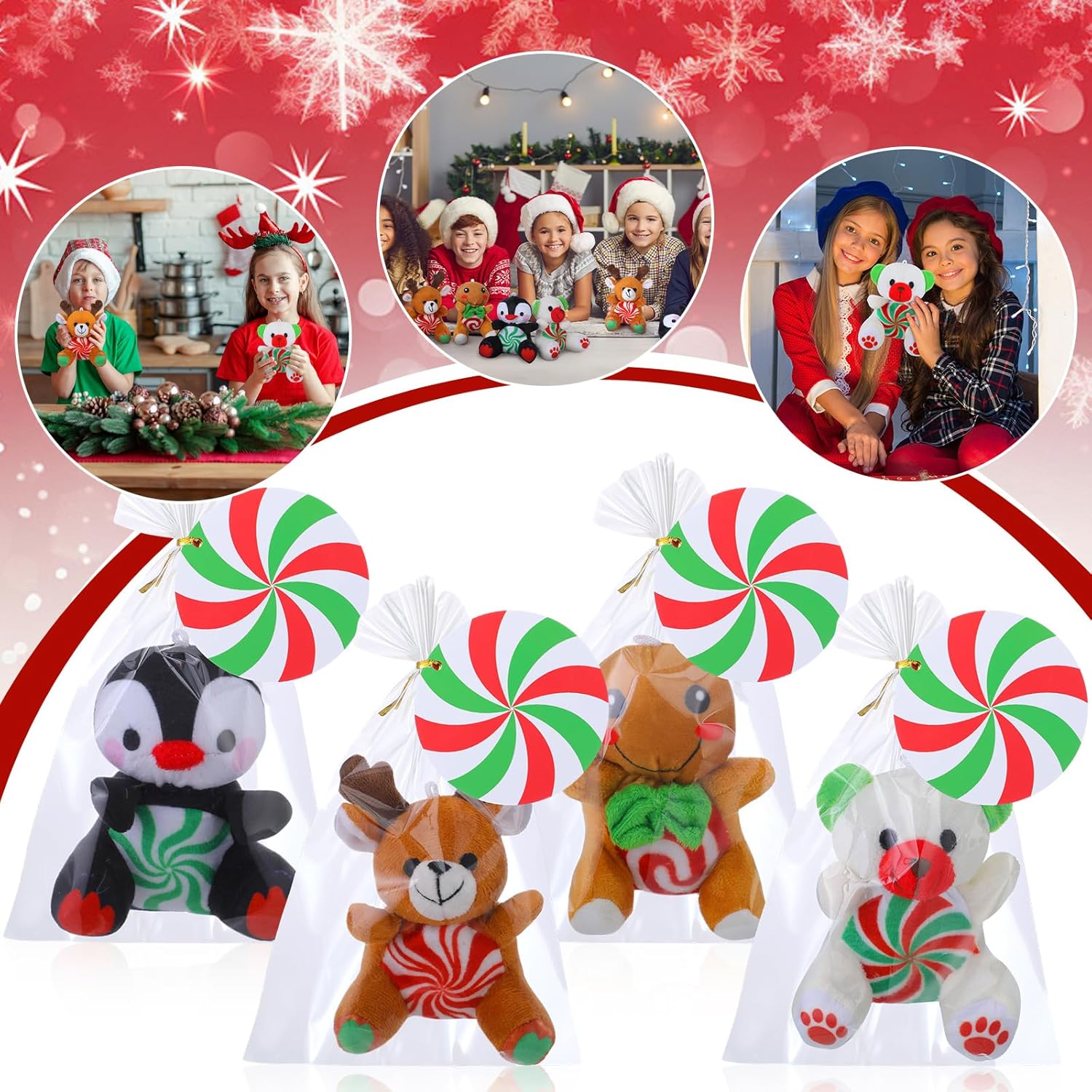 Features: Thoughtful gifts Christmas mini plush bears with cards are Christmas exchange prizes gifts, and these stuffed animals also can be applied as Xmas celebration gifts for lovers, family, classmates and friends. You can also write blessings on the back of the greeting card and those who receive the gift will be very surprised and happy. Reliable material The Christmas party favors are mainly made of soft velvet and PP cotton, which is soft and comfortable to touch, light and sturdy. The Xmas peppermint candy cards are made of paper cardboard, the surface is covered with waterproof film. Exquisite design and craft bring them full appearances and vivid colors, you can use them for a long time. Specifications: Main material: soft velvet and PP cotton, paper cardboard Color: red, green, white Size: about 4 inches Package Includes: 20 x Christmas stuffed toys 20 x Christmas peppermint candy cards 20 x Christmas cellophane gift bags 20 x Golden ties Notes: Manual measurement, please allow slight errors in size. The color may exist a slight difference due to different screen displays