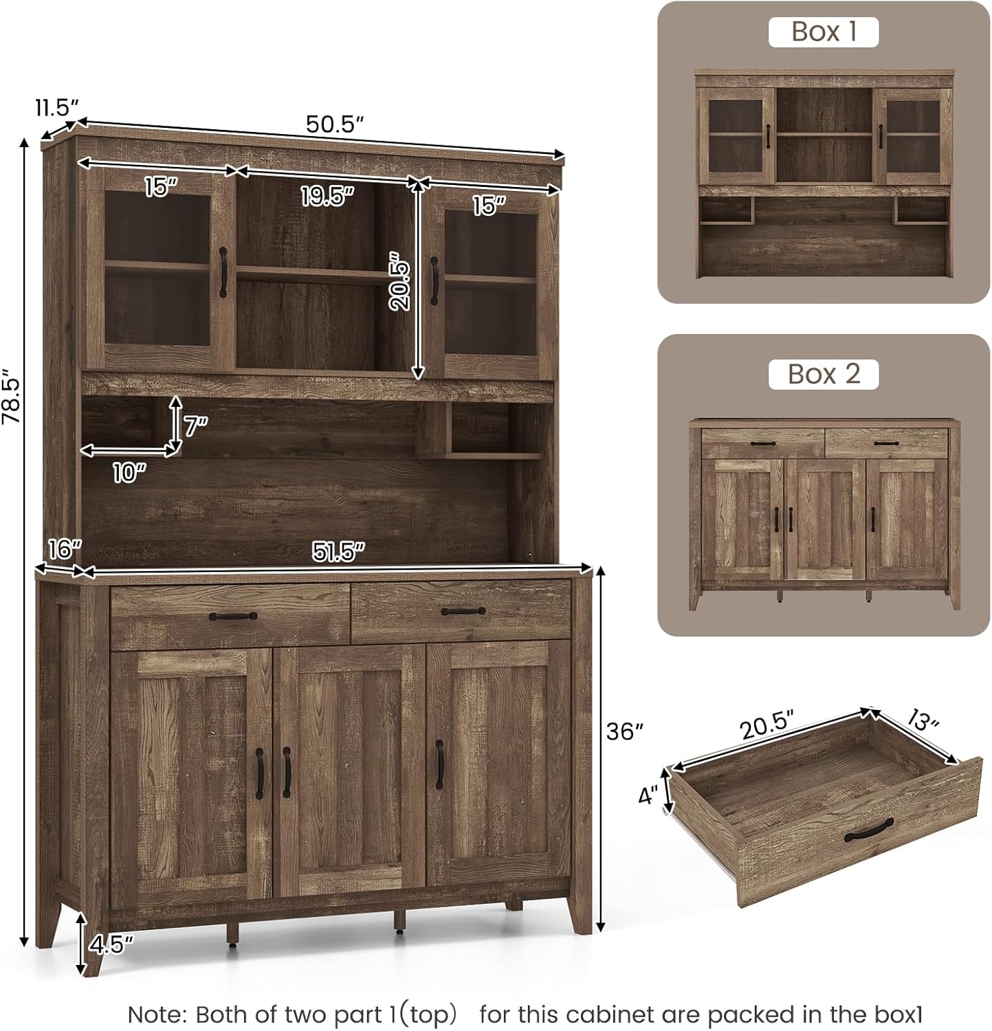 Description: Discover the Ultimate Kitchen Transformation! Elevate your space with the epitome of style and functionality - our premium tall pantry cabinet! Perfectly engineered to maximize your kitchen’s potential, this marvel offers a spacious countertop for your microwave, 2 large drawers and 3-door cabinet, and a hutch cabinet with magical visibility through stylish tempered glass doors. Transform and organize with an incredible 6 adjustable shelves providing endless customization. Prioritize safety with our reliable anti-tipping design for a worry-free experience. Built to dazzle and last, showcasing a chic wood grain finish that breathes elegance into any setting. Don’t miss out! Make it yours and redefine the essence of a modern kitchen! Features: Tall cabinet with multiple storage options makes good use of space Accommodate snacks, condiments, tableware, and decorations 6 adjustable shelves, each with 3 positions, provide customized storage space Open countertop area offers easy access to kitchen appliances Anti-toppling kit to keep the cabinet in place Tempered glass doors ensure visibility and durability 6-leg base ensures long-lasting support Smooth metal slides and high-quality metal hinges for a better user experience Comes in 2 boxes (hutch in box 1, bottom cabinet in box 2) Specification: Color: Brown Material: Engineered Wood, MDF, Tempered Glass Overall Dimensions: 51.5” x 16” x 78.5” (L x W x H) Countertop Height from Ground: 36” Countertop to Hutch: 18” Dimensions of Top: 50.5” x 11.5” (L x W) Interior of Drawer: 20.5” x 13” x 4” (L x W x H) Net Weight: 181 lbs Package Includes: 1 x Kitchen Pantry Cabinet 1 x Instruction