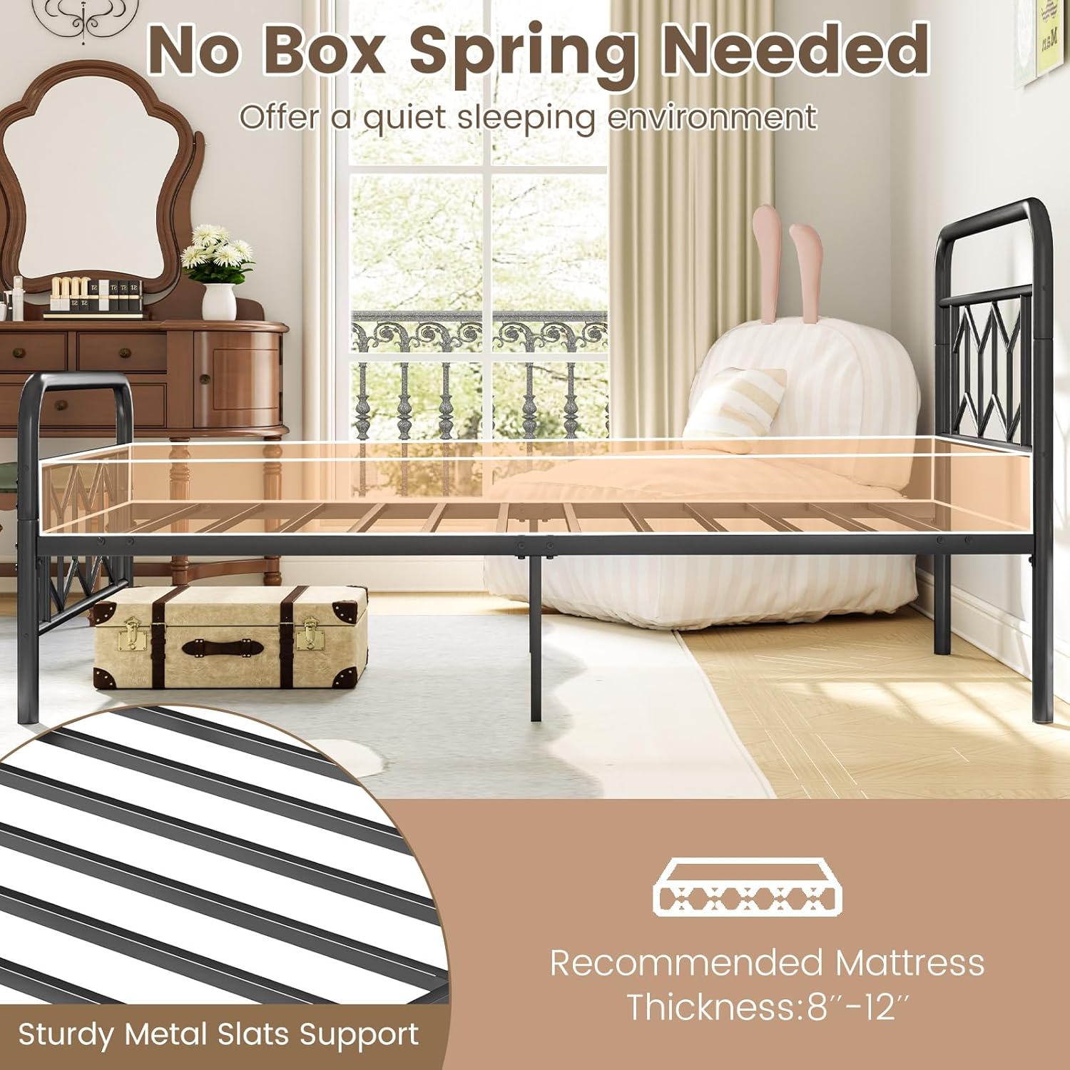 Description: Embrace sophistication in your sleep space with our metal platform bed frame! The diamond-accented high headboard and footboard add a modern, elegant touch, while the all-metal construction with extra support legs ensures exceptional stability and a weight capacity of up to 660 lbs. Designed with 12 heavy-duty metal slats, the twin bed frame eliminates the need for a box spring, offering reliable support for your mattress. It also features 12.5” of under-bed clearance, making it ideal for storage and easy cleaning. Additionally, the innovative snap-lock design allows for quick, hassle-free assembly of the slats. Our metal bed frame can be a practical and stylish addition to your bedroom. Features: Sturdy metal slats support the mattress directly Snap lock design allows for quick installation 2 extra support legs provide enhanced stability 12.5” under-bed clearance provides ample storage and sweeping space Vintage-inspired design effortlessly complements various interior styles Non-slip foot pads protect the floor from scratches No box spring needed for your convenience Specifications: Color: Black Material: Metal Overall Dimensions: 78” x 40” x 41” (L x W x H) Size of Platform Surface: 75” x 39” (L x W) Spacing Between Headboard and Platform Surface: 7” Height off the Ground: 12.5” Recommended Mattress Thickness: 8”-12” Max Load Capacity: 660 lbs Net Weight: 37.5 lbs Package Includes: 1 x Twin Size Platform Bed 1 x User Guide