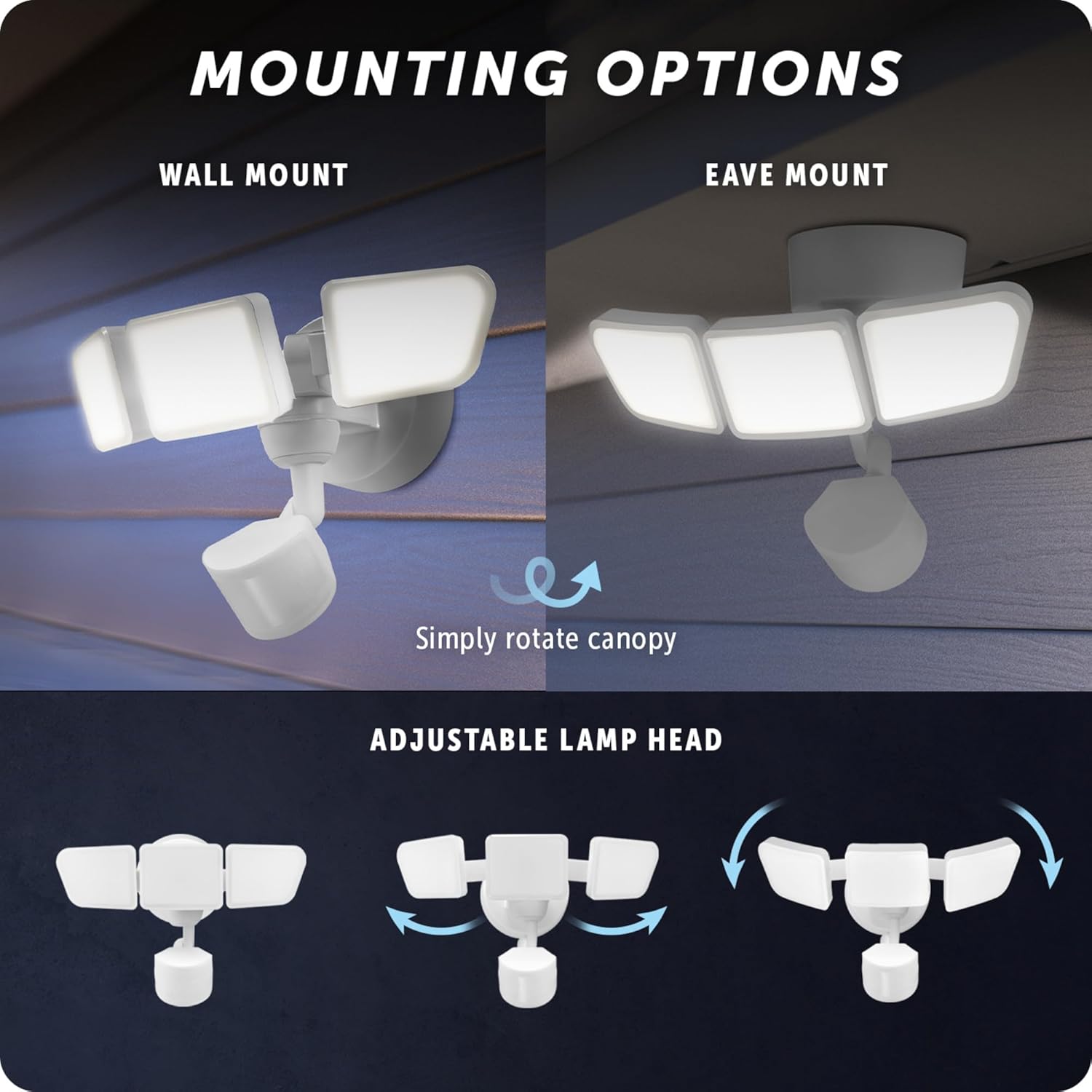 Upgrade your outdoor spaces with the Motion Activated Flood Light Security Light! Experience motion detection capabilities from all angles with a remarkable range of up to 50 feet or 15 meters and a wide 240° detection zone. Blind spots be-gone! Automatically turning off after 1, 5, or 20 minutes gives you the flexibility to choose the duration that suits your needs. Equipped with the MOTIONBRIGHT feature, you have constant low ambient lighting when no motion is detected and full brightness when motion IS detected, saving energy while staying safe. The motion sensor has a sensing angle of 240 degrees with a range of approximately 50 feet/15 meters. Your security is never compromised, and the powerful 3200 lumen, daylight white 4000 Kelvin light disperses evenly for quick illumination. Installation is a breeze with the included Dual Mount system, offering wall or eave mounting options, ensuring a perfect fit for your house's layout. Backed by a 2-year warranty.