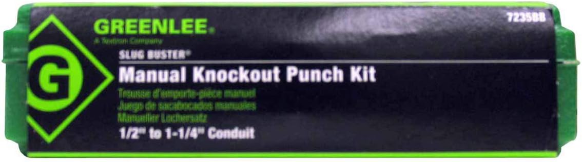 Product Description Master your jobs with speed and accuracy with the Greenlee Slug-Buster 1/2" - 1-1/4" Manual Knockout Set (catalog number 7235BB). Designed for plumbing experts, this knockout kit is made for use with the new Greenlee KRW-1 High-Leverage Ratchet Wrench and includes 1/2", 3/4", 1", and 1-1/4" slug buster punches and dies, draw studs, and a plastic carrying case. It makes it easy to create punch holes for most conduit sizes in mild steel, up to 10-gauge aluminum, brass, copper, fiberglass, and plastics. The Slug-Buster punch profile allows for easier slug removal, and the ergonomic knurled edge on the punches provides a firm, comfortable grip during use. For additional convenience on the jobsite, each piece features laser markings so you can quickly identify the tool needed and alignment markings for optimal accuracy. The draw studs with "dog point" tips make threading a breeze and help eliminate cross-threading for a superior performance every time. Greenlee: Professional. Nothing Less.™ Amazon.com Includes assortment of commonly used Slug-Buster knockout punches. View largerBall bearing draw stud 1 hex head.View largerUnique punch profile also splits slugs for easier slug removal.View largerSlug-Buster Manual Knockout KitThe Greenlee Slug-Buster manual knockout kit for 1- to 1-1/4-inch conduit is favored by most electrical experts. This hole-making kit was made for the serious contractor or electrician, as well as for the do-it-yourself handyman, coming complete with the most common size of hole-making tools--including punches, dies, and draw studs--to meet the busy electrician's needs on the construction site.Versatile PerformanceThe Greenlee Slug-Buster knockout kit will create punch holes for most conduit sizes, including 1/4 inch, 1/2 inch, and 3/4 inch, as well as for 1-inch and 1-1/2-inch holes. Exceptionally versatile, the tools in the Greenlee Slug-Buster knockout kit will make holes in mild steel and in aluminum up to 10 gauge; they will also punch holes in fiberglass and plastic and can make holes for conduit with an outside diameter of 7/8 inches. Thoughtfully designed, the Slug-Buster can be used with a battery or hydraulic ratchet, as well as with a manual ratchet.Slug-Buster Knockout Punches 0.492 Inch to 2.520 InchesUnique punch profile splits slugs for easier slug removalUse with battery-powered, hydraulic, ratchet, or manual driversUses standard Greenlee dies and draw studsSlug-Buster punches available in sizes up through 2.52 inches (64 mm)Carrying CaseA high-impact, rugged plastic carrying case with a secure-closing lid comes included for keeping all the pieces neatly organized (they snap into place) and easy to transport from one job site to the next.Slug-Buster Knockout Punch Kit Includes:About GreenleeGreenlee is a leader when it comes to developing innovative tools for electrical contractors. It started in 1862 with the Greenlee brothers' barrel-making machines, then woodworking tools. Today, Greenlee is a respected and trusted source for professional-grade wire- and cable-installation tools. From hole making and bending to test and measurement, Greenlee provides an array of tools to make your job faster, safer, and easier.Greenlee Textron Inc. warrants to the original purchaser of these goods for use that these products will be free from defects in workmanship and material for their useful life, excepting normal wear and abuse.* This warranty is subject to the same terms and conditions contained in the Greenlee Textron Inc. catalog.*Standard one-year limited warranty. P.when('A').execute(function(A) { A.on('a:expander:toggle_description:toggle:collapse', function(data) { window.scroll(0, data.expander.$expander[0].offsetTop-100); }); }); From the Manufacturer Greenlee Slug-Busters can be used on mild steel up through 10 gauge (3.5 mm). Application: Punch mild steel, aluminum, fiberglass and plastic. Hole size is outside diameter of US conduit sizes. Example: 1/2-Inch conduit size punch actually makes a 7/8-Inch hole. Operates with battery, hydraulic, ratchet or manual drivers. Punch kit includes punches, dies and draw studs for punch holes for conduit sizes 1/2, 3/4, 1 and 1-1/4-Inch. See more
