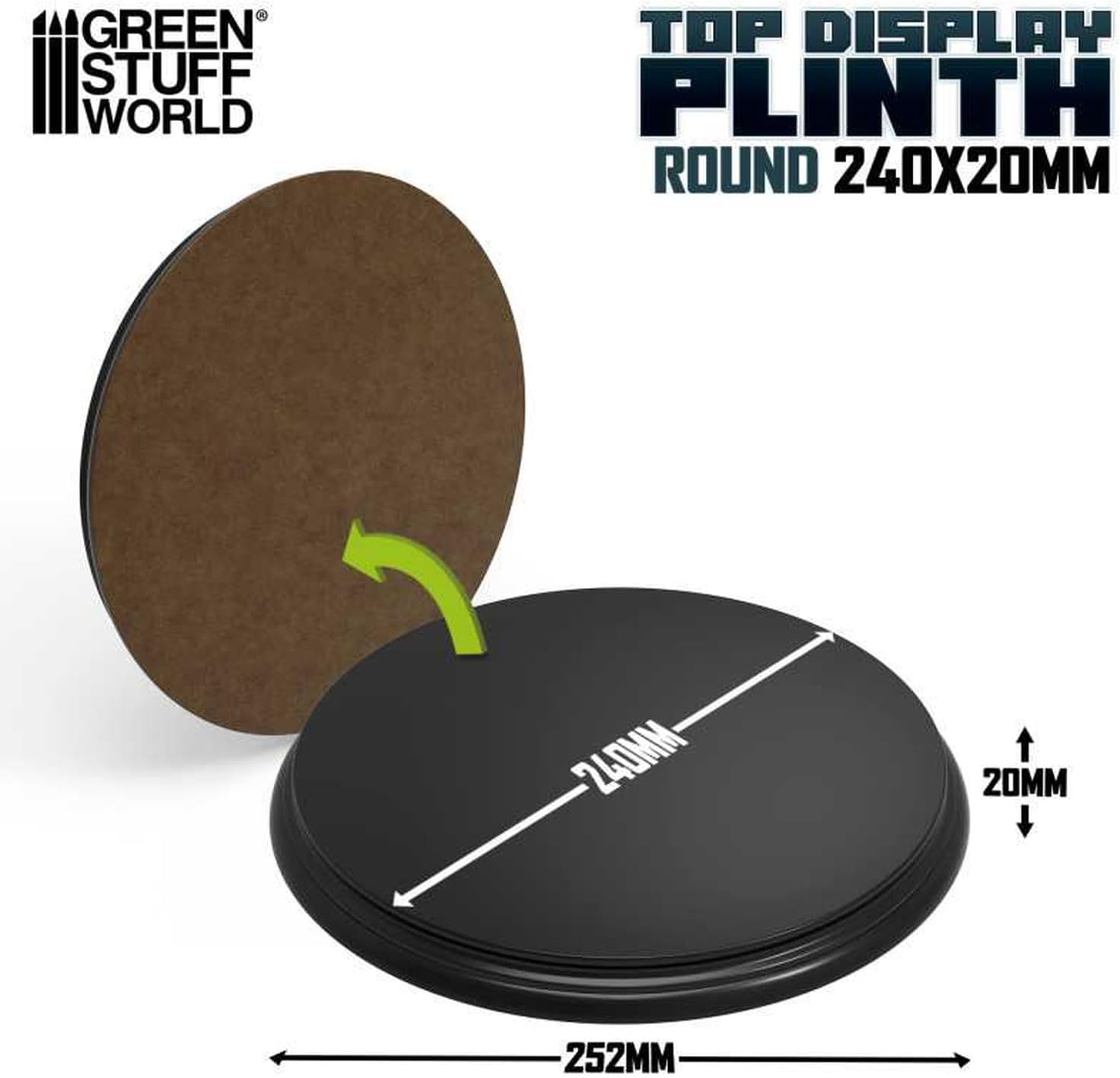 Greenstuff World "Round Display Stand, 9.4 inches (24 cm) Diameter, Black" Hobby Accessory The display base is made of black MDF wood with a lacquered finish, perfect for displaying figurines. Wooden base for miniatures Dimensions: 9.4 inches (240 mm) Height: 18mm Base: 252mm Color: Lacquer Black. Material: MDF wood This product is a hobby accessory. Does not include any other than this product (adhesives, paint, tools, batteries, etc.)