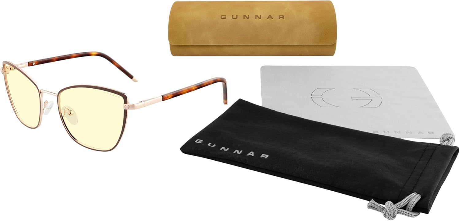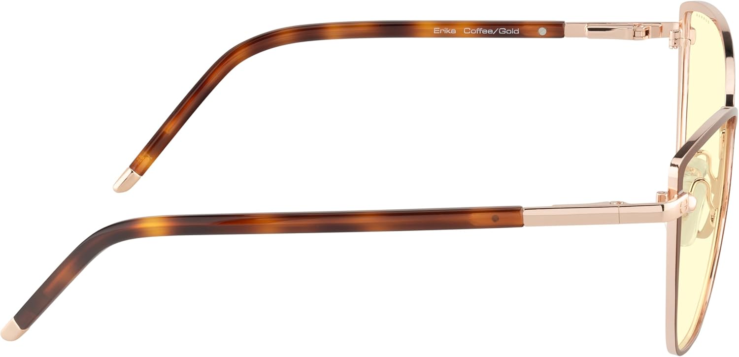 Discover the perfect blend of fashion and function with the GUNNAR Erika Blue Light Glasses in Coffee Gold with Amber Lenses. Part of the Kista Collection, Erika’s cat-eye design is inspired by Nordic innovation hubs, delivering a stylish accessory that complements any look. Crafted from a hybrid of stainless steel and Italian acetate, Erika is lightweight yet durable, designed for long-lasting comfort. With patented GUNNAR blue light blocking technology, these glasses protect your eyes from harmful digital blue light, helping to reduce eyestrain, dryness, and headaches. The amber lens tint enhances contrast, reduces glare, and supports better sleep, making it ideal for evening use and long hours at the computer, gaming, or streaming. Featuring flexible spring hinges and G-Shield® coatings for anti-reflective, smudge-resistant clarity, Erika combines premium quality with everyday wearability.