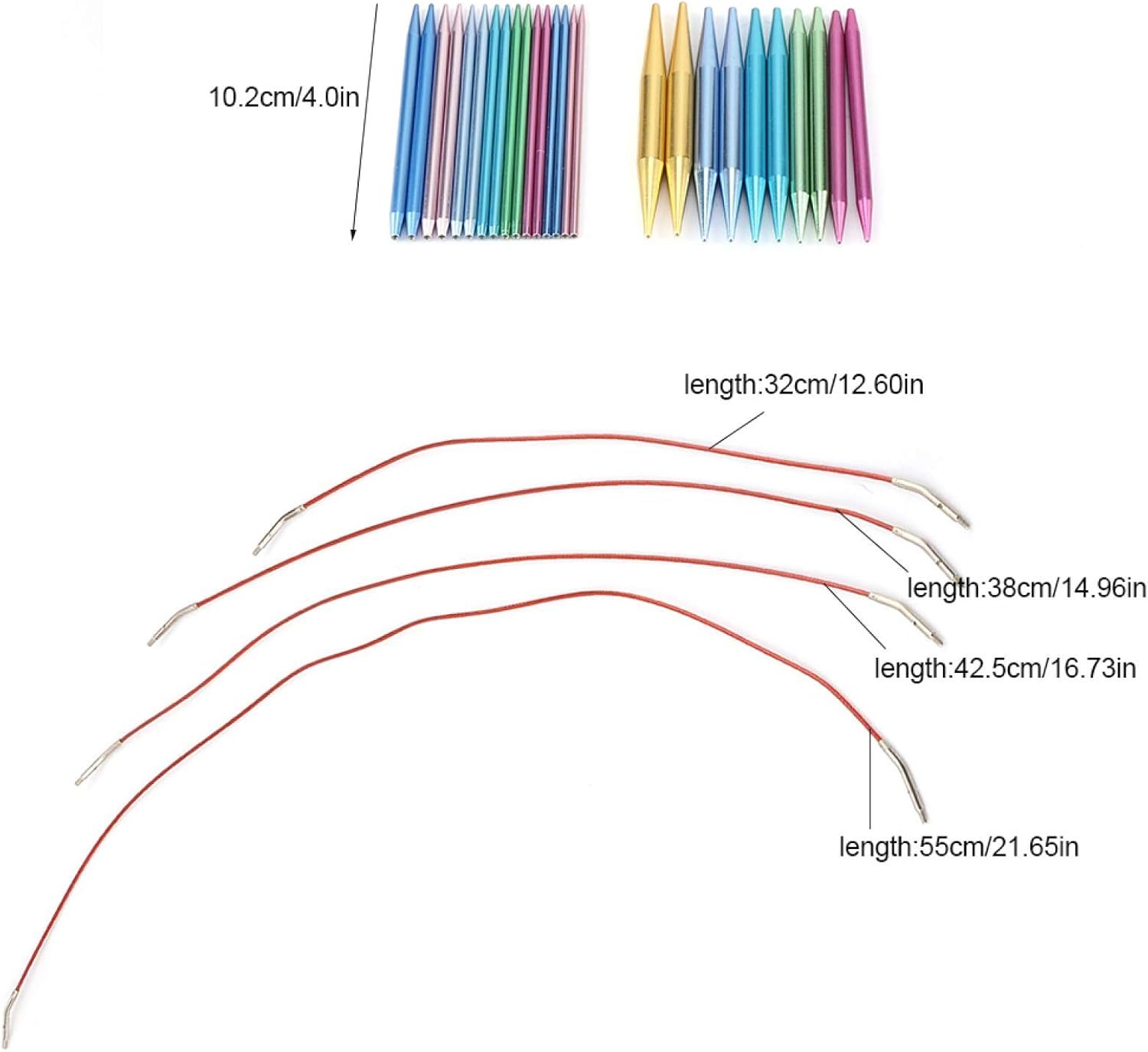 Specification:Material: Aluminum + PlasticColor: ColorfulSize:Needle: 10.2cm / 4.0 inch(Approx.)Wire: 32cm / 38cm / 42.5cm / 55cmPackage list:13 pairs * Aluminum Needles 4 * Circular Plastic Wires 4 * Positioning buttons 1 * Tool post 2 * Extend Connect tool 1 * Bag CaseRemarks: The old and new are shipped randomly