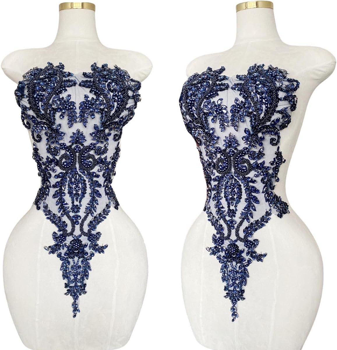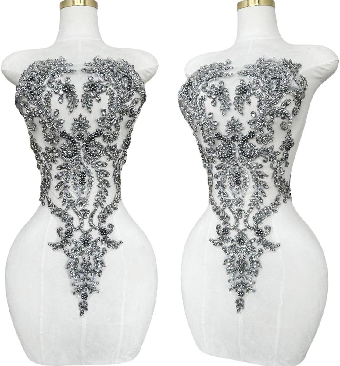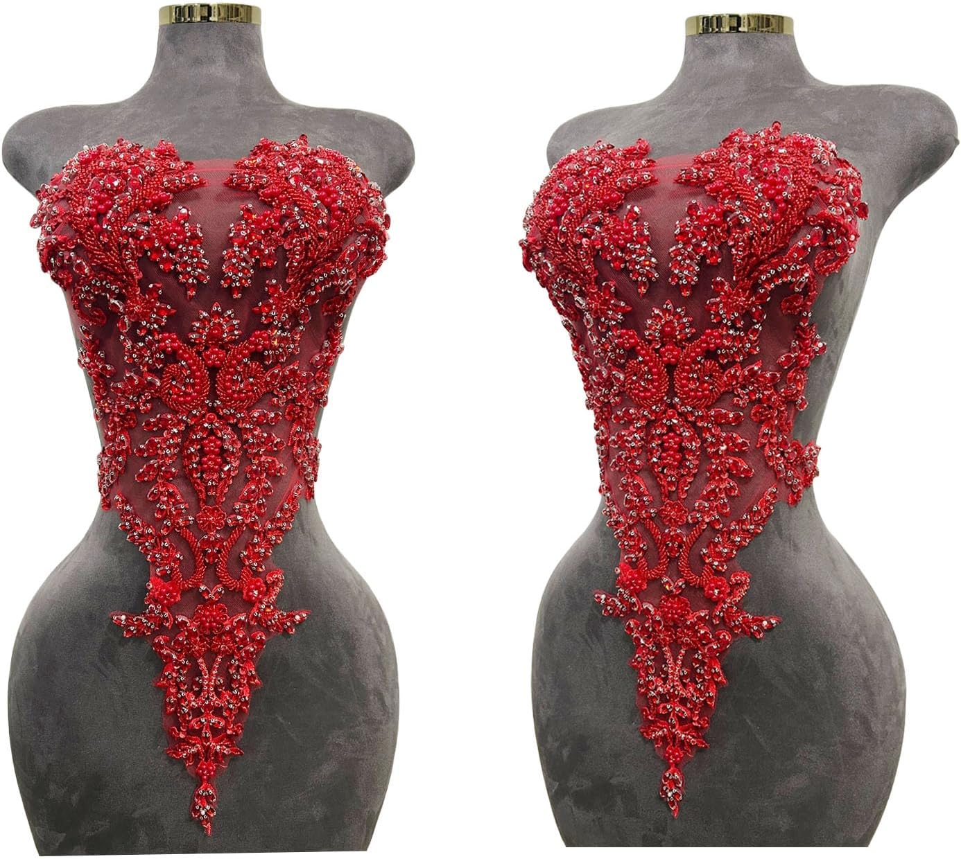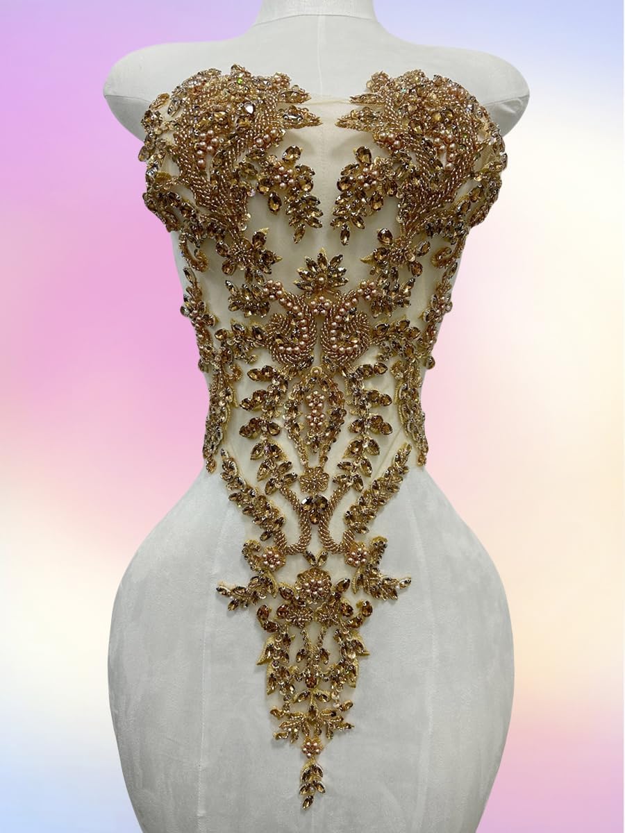 Introducing our beautiful handmade Rhinestones Lace Bodice Applique! This exquisite piece is perfect for adding a touch of elegance and sophistication to your dress or clothing accessories. Crafted from high quality beads and sequins, our beaded appliqué is sure to catch the eye and turn heads. Sew this stunning trimming patch onto any fabric of your choice and let the intricate detailing and sparkle do all the talking. Whether you're a fashion designer, DIY enthusiast or just want to add a bit of sparkle to your wardrobe, our Beaded Appliqué is the perfect accessory. Don't settle for ordinary, make a statement with our Handmade Rhinestones Lace Bodice Applique today!