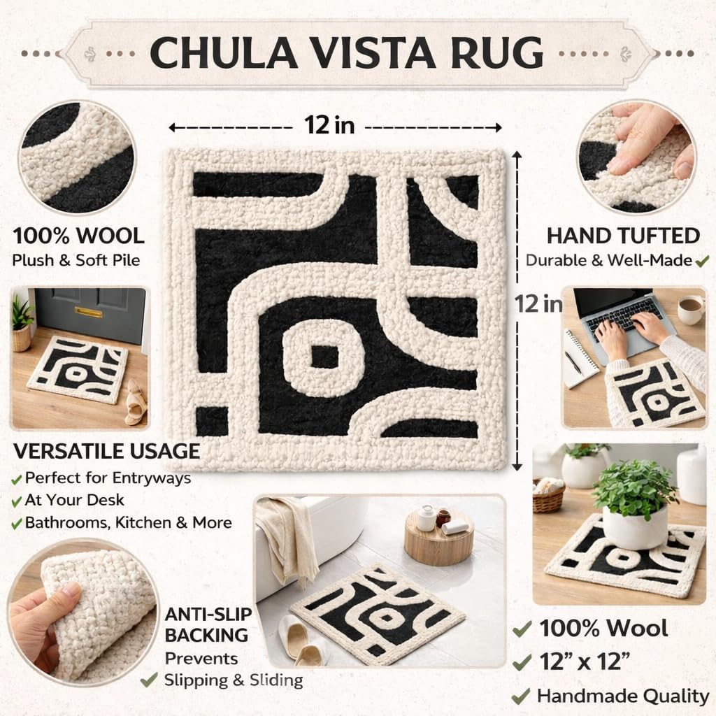 This 1 x 1 ft handmade wool rug is designed as a versatile décor accent for modern interiors. Carefully handwoven using quality wool, it provides a soft texture while maintaining a structured and artistic appearance. The abstract geometric pattern brings a contemporary touch that complements a variety of décor styles, from minimalist to creative spaces. Due to its compact size, this rug is especially suitable for small areas and styling purposes where traditional rugs may feel oversized. It works well as both a functional and decorative piece, allowing you to add texture, warmth, and design interest without overwhelming the space. Each rug is handcrafted, resulting in natural variations in weave and color that highlight its artisanal character. Designed for indoor use, this wool rug is easy to place, reposition, and layer with other décor elements. Floor Accent Mat: Place near a bedside, reading chair, or small seating area for a subtle decorative touch Entryway or Corner Decor: Ideal for entry corners, hallways, or unused spaces to enhance visual balance Table or Stool Cover: Can be used on stools, benches, side tables, or low furniture for added texture Wall or Display Decor: Suitable for creative wall décor or display styling in modern and artistic interiors Shelf & Console Styling: Adds depth and softness when placed on open shelves, consoles, or display units Office & Studio Accent: Enhances workspaces, studios, or creative rooms with a modern design element Layered Décor Piece: Works well layered with larger rugs for a curated and designer look Gift Option: A thoughtful décor gift for housewarmings, festivals, or special occasions