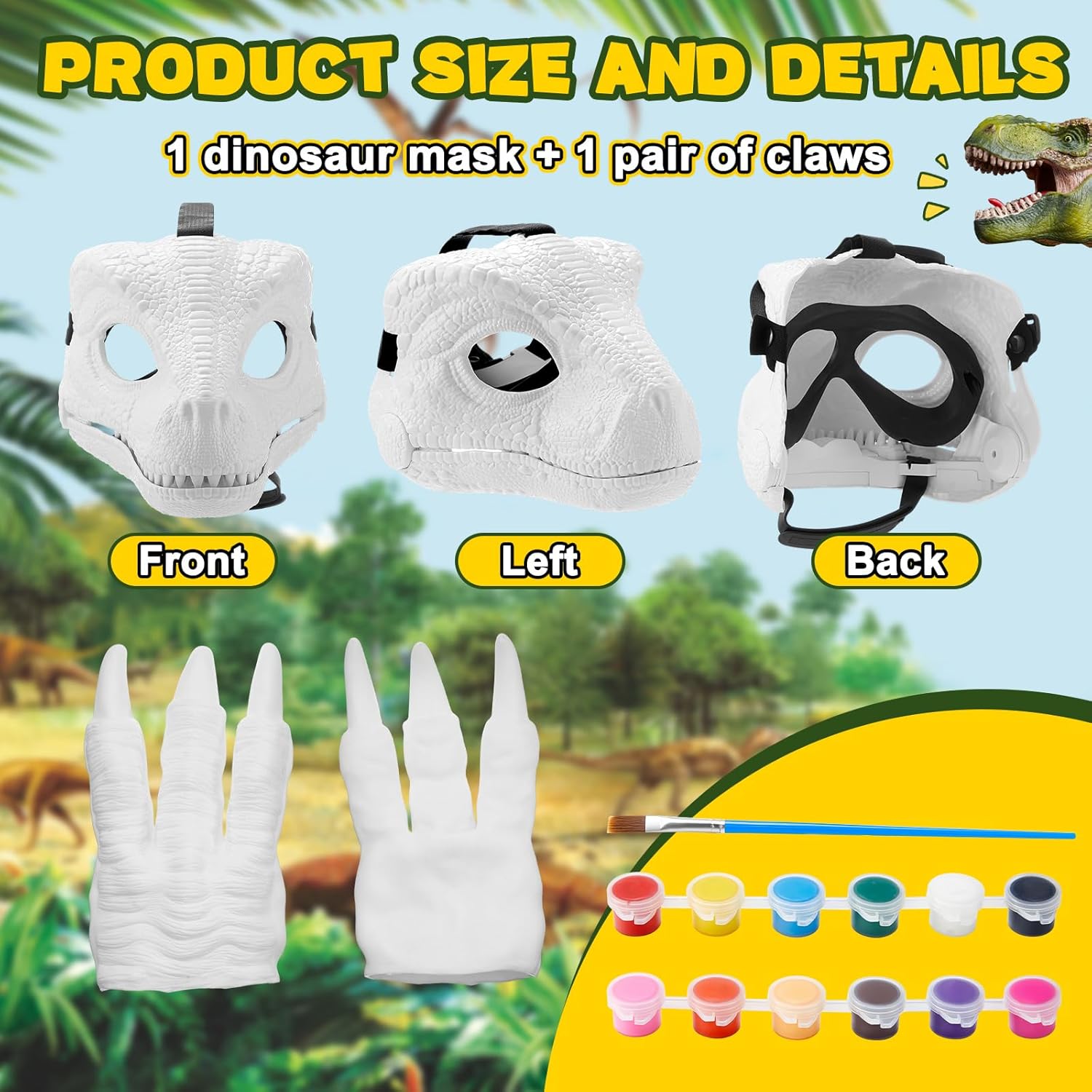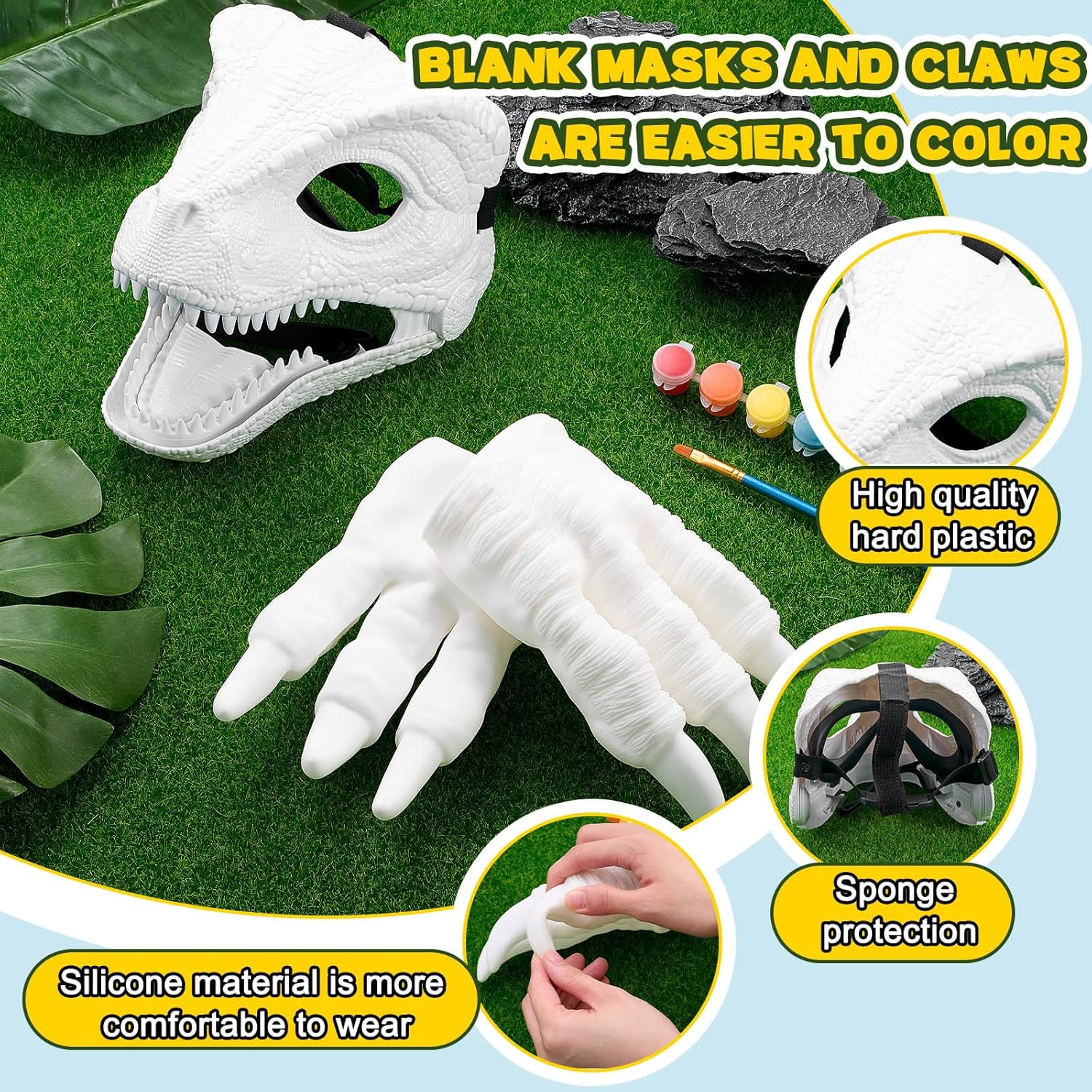Features: This DIY realistic mask set can cultivate adult's patience and ability to paint by hand, and can bring a sense of accomplishment after completion. The buckle on the back of dinosaur mask can be adjusted according to head circumference, comfortable to wear for both adults and families. Specifications: Material: hard plastic ABS, vinyl Color: white Size: about 7.87 x 8.66 x 6.69 inches/ 20 x 22 x 17 cm Package includes: 2 x Hard plastic dinosaur mask 4 x Dinosaur claws Notes: Manual measurement, please allow slight errors on size. The color may exist a slight difference due to different screen displays.