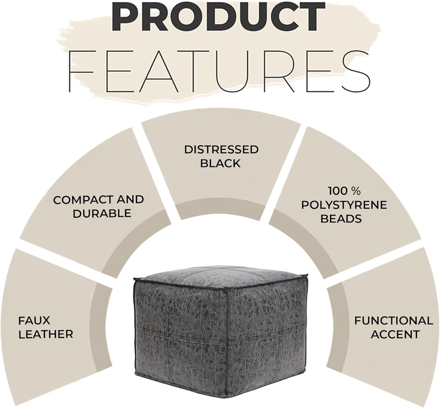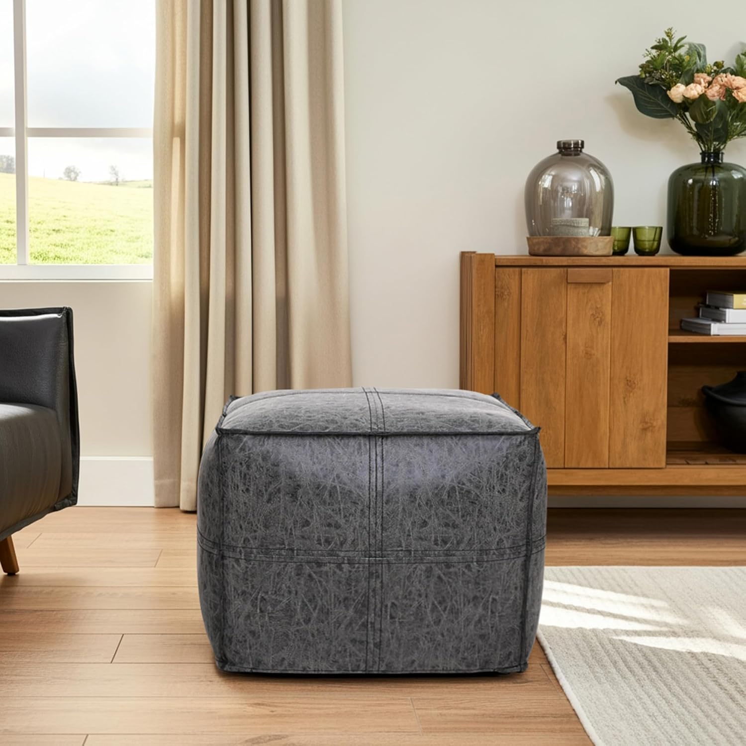 his square distressed vegan leather pouf ottoman combines comfort, durability, and modern style. Designed with a textured distressed finish, it adds a warm and stylish accent to living rooms, bedrooms, or lounge areas. The compact cube design makes it a versatile addition to any space where extra seating or a comfortable footrest is needed. Filled with high-density foam cushioning, the pouf provides supportive comfort whether used as a foot stool, additional seating for guests, or a decorative accent piece. Its 18 x 18 x 14 inch size makes it ideal for apartments, small spaces, and flexible seating arrangements. Whether placed beside a sofa, chair, or vanity, this pouf ottoman offers both function and style. Its durable construction and ready-to-use design make it a practical addition to modern, boho, or contemporary interiors.