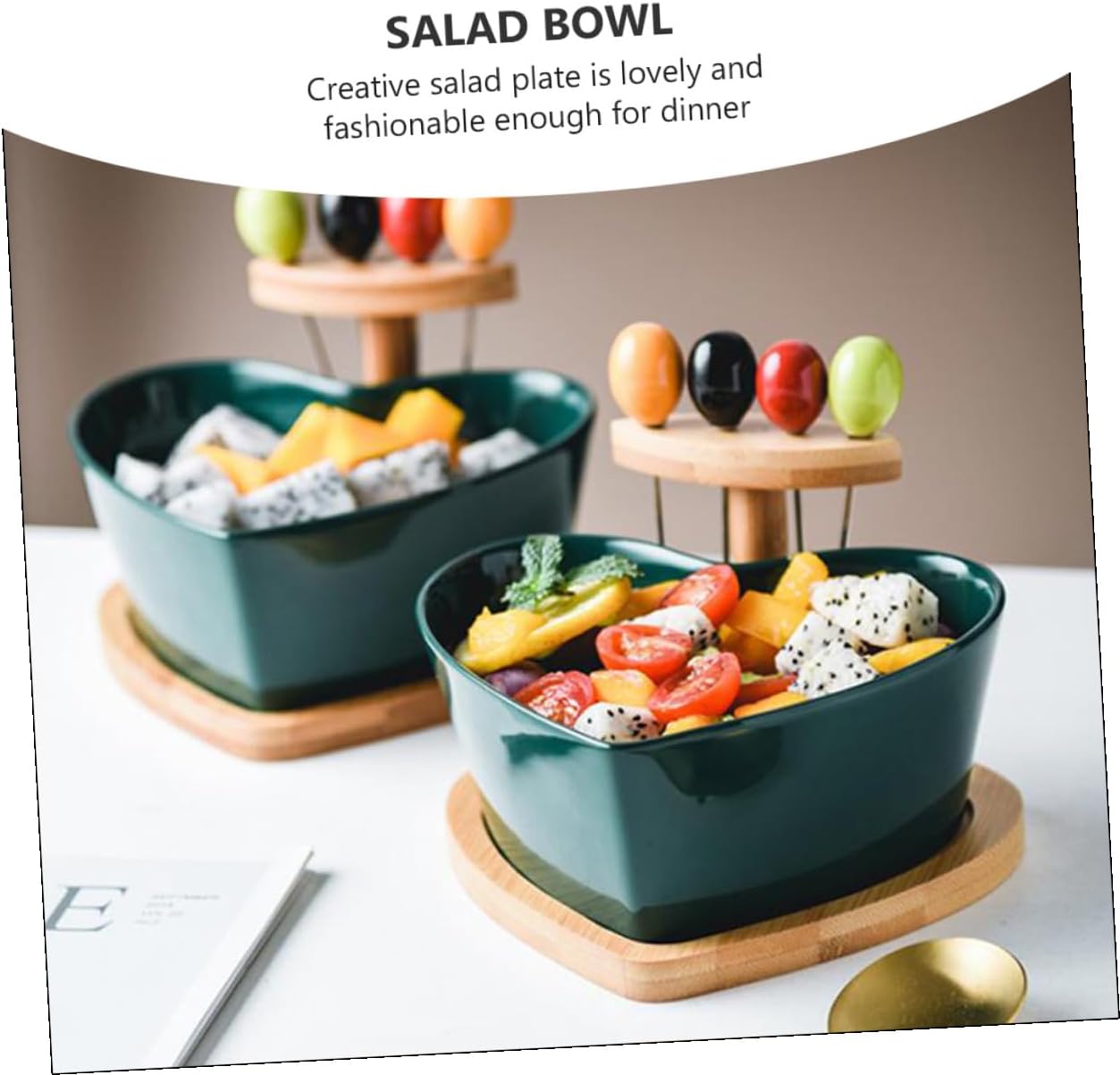 Package List 1 x Bowl 1 x Stand 4 x Forks Features -Material: Ceramic Wooden -Product Info:Fruit Bowl - The wooden tray is easy to move the salad bowl, and can protect the table from being scalded when the ceramic tableware is holding hot food Ceramic Bowl with Fork. - The plate is made of ceramics material, so they are safe for your health. - Perfect for appetizers, chips, sweets, fruits and vegetables, dips and hot food Ceramics Salad Plate. - Creative salad plate is lovely and fashionable enough for dinner, parties and casual gathering for everyday use Ceramics Salad Bowl. - With 4 colorful metal forks, it is very suitable for sharing food with friends and family.Goods InformationPorcelain Serving Dish Its heart shape design makes it looks beautiful, perfect for a variety of foods.Food Serving Plate Natural modern design, premium ceramics material will showcase your favorite foods.Dessert Bowl This is a heart shape salad bowl, which is great as salad plate, dessert plate and as vegetable plate