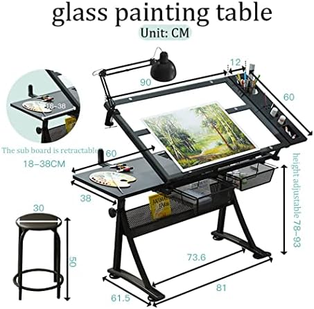 Transform your creative space with the Adjustable Drafting Table with Stool, the perfect solution for artists, designers, and students seeking a functional and stylish workstation. This versatile drafting table features a tiltable tabletop, allowing you to customize your workspace for various projects, from sketching to drafting. With two spacious storage drawers, you can easily organize your art supplies, keeping everything within reach. Measuring 119-140*60*78-93CM, this drafting table offers ample surface area while remaining compact enough for easy transport, with a convenient packaging size of 105*68.5*16CM. Weighing 28kg, its sturdy construction is enhanced by a 5mm thick glass panel, ensuring durability for long-term use. The sleek design is complemented by a modern electrostatic powder-coated finish, while the elegant black panel seamlessly fits any decor style. The robust stainless steel legs, featuring a powder coating of 1.0 mm thickness, provide exceptional stability and support, making this table suitable for a variety of environments, including homes, offices, and educational settings. Whether you're working on intricate designs or simply need a reliable workspace for study, this drafting table adapts to your needs. Included in the package are the drafting table, a comfortable stool, and an easy-to-follow instruction manual for quick assembly. Please note that actual colors may slightly differ from images due to monitor settings, and there may be a 1-3 cm variance in manual measurements. Your satisfaction is our priority, so if you have any questions or concerns, please reach out to our dedicated customer service team, who will respond within 24 hours.